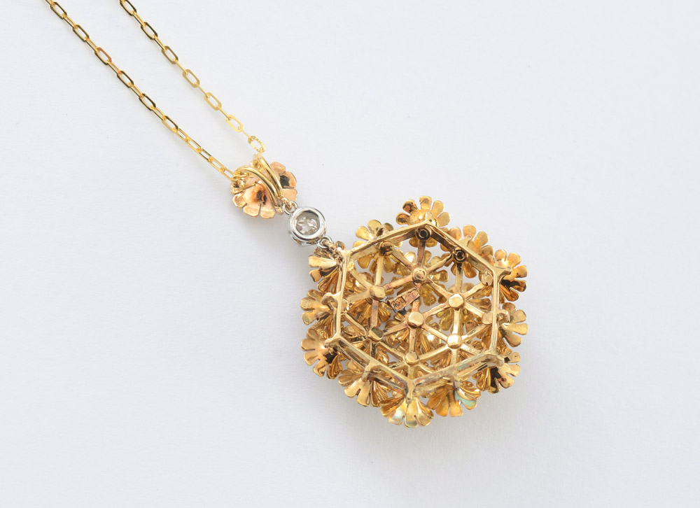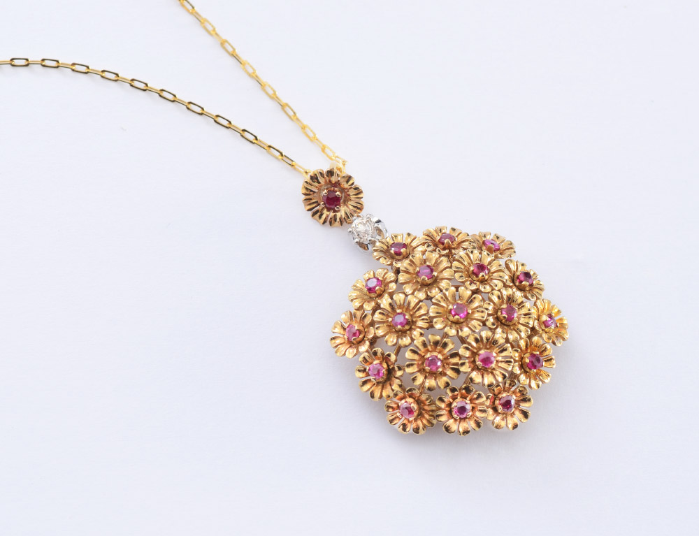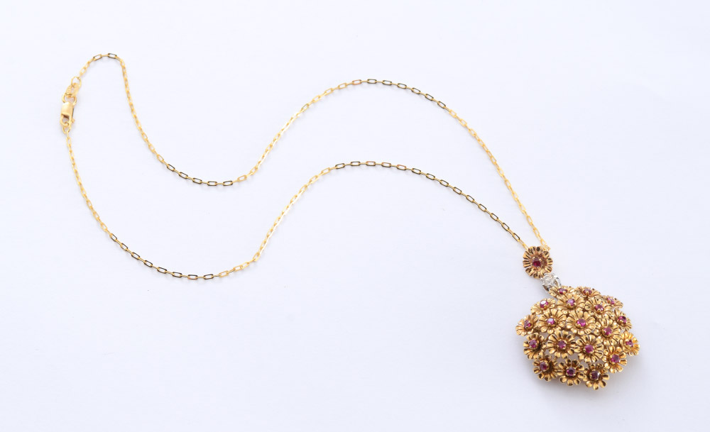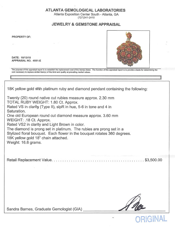 18K ROTATING RUBY PENDANT NECKLACE: Illegibly signed 18K yellow gold native cut ruby and diamond pendant with each of the ruby flowers rotating 360 degrees. Rubies total approx. 1.80 Ct, rates VS clarity and 4 in saturation. Set in platinum, the single old European diamond is .18 Ct, of VS2 clarity and light brown in color. Pendant measures approx. 1 1/4'' dia. The 18K yellow gold chain is 18''. Weight 16.6 grams. Sold with current Atlanta Gemological GIA graduate's appraisal for $3,500.