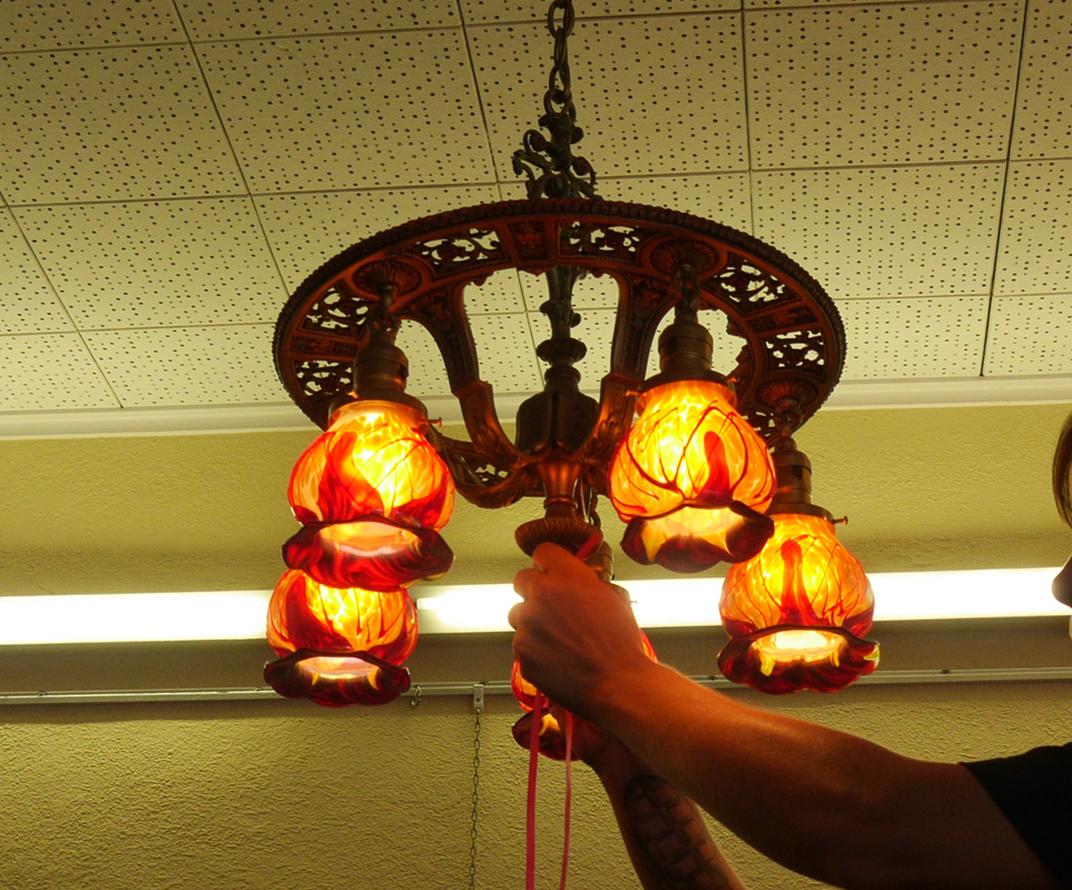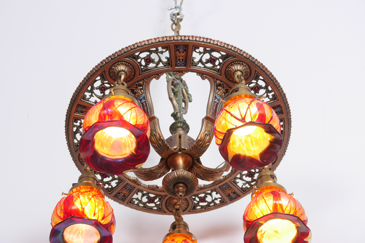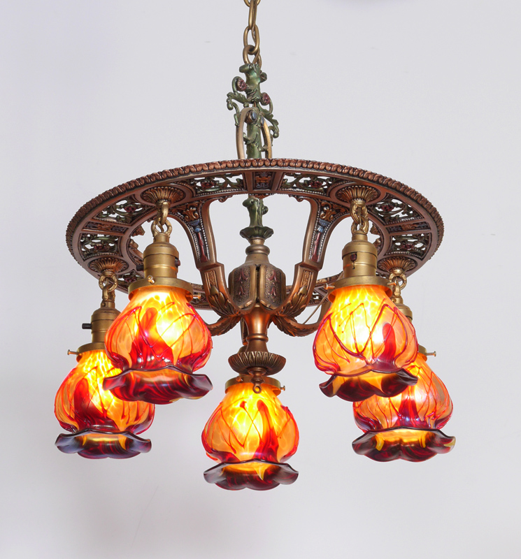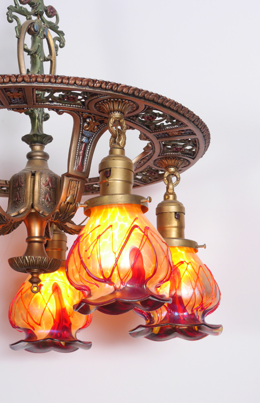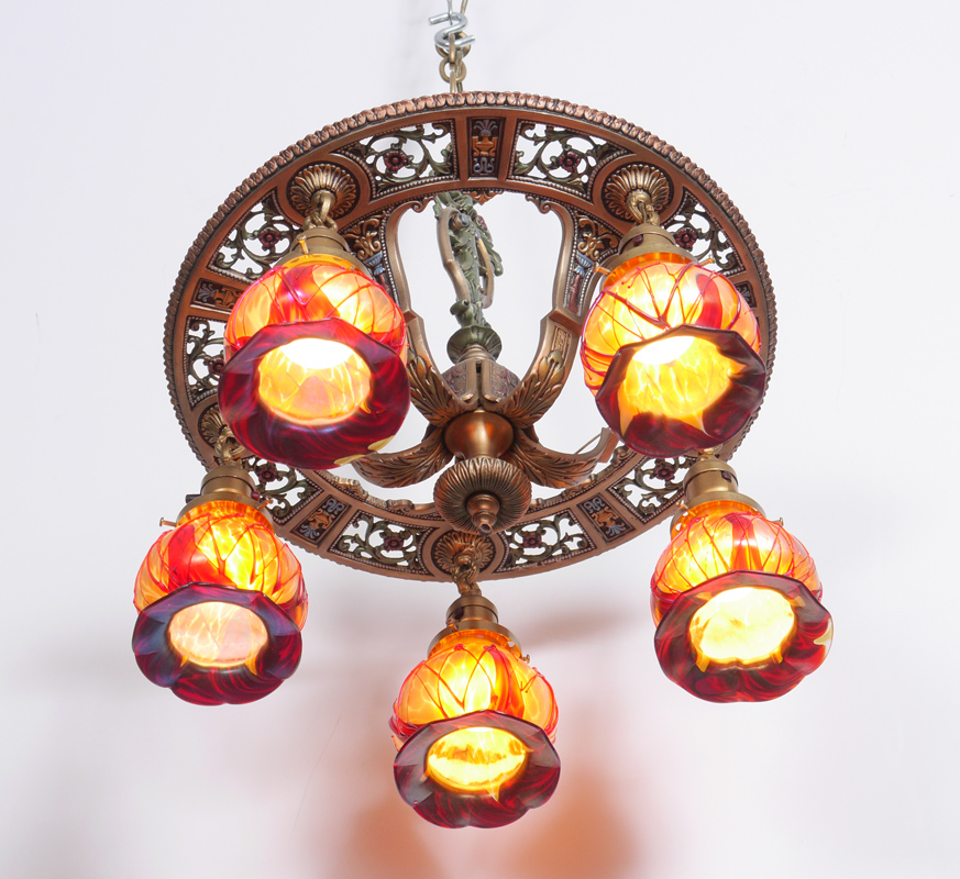 ART GLASS SHADE CHANDELIER: 5 light chandelier, pierced metal frame. Iridescent art glass shades with applied threading 15 1/2'' h. x 15 1/2'' dia., shades 4 1/2'' h. x 4 1/2'', 2'' fitter rims. Ceiling cap in office.