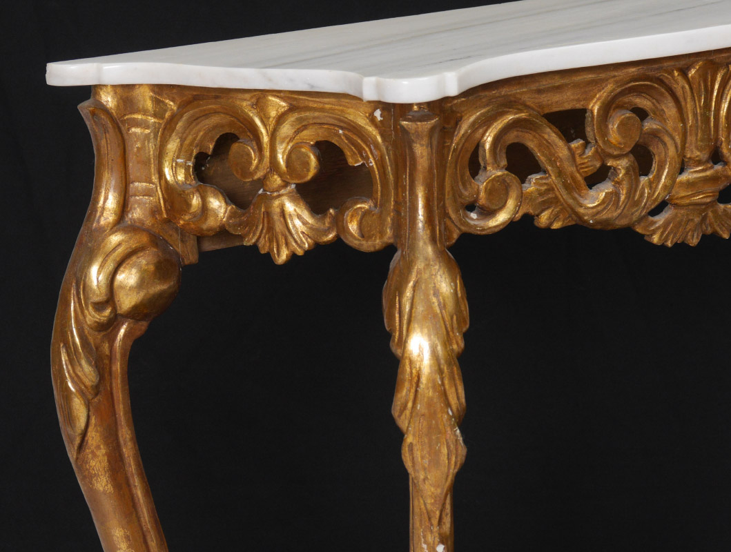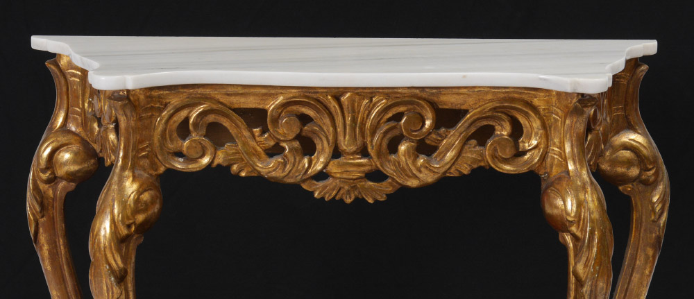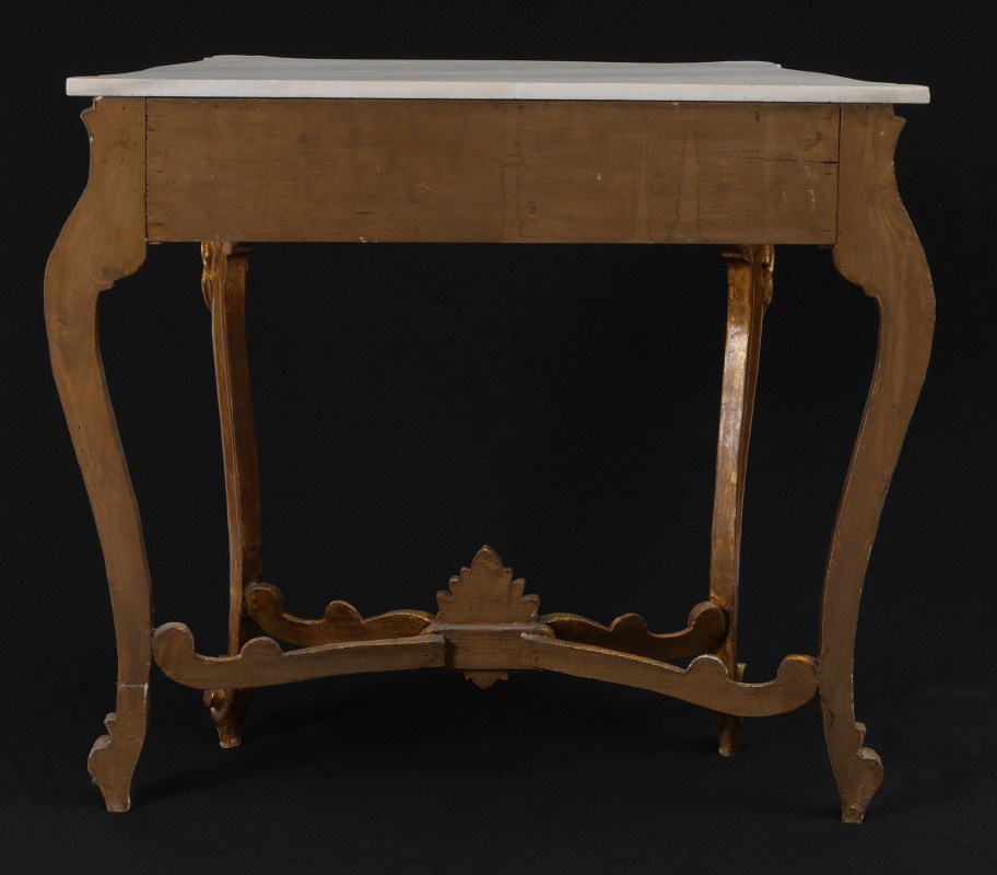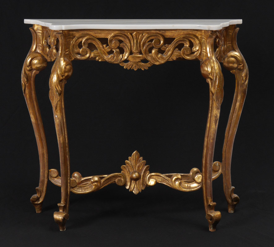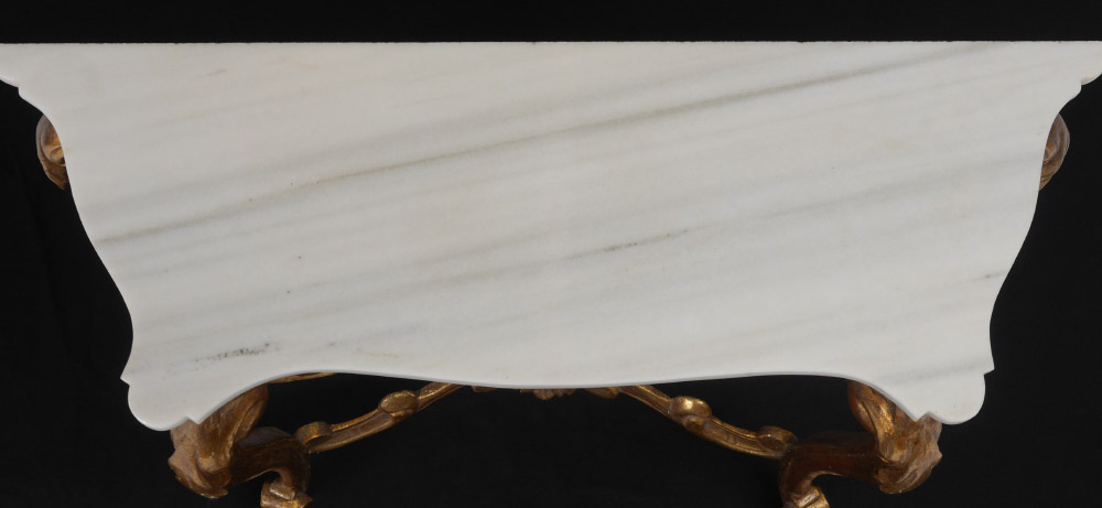 MARBLE TOP GILT WOOD HALL TABLE: Shaped white marble top, carved gilt wood base with foliate motif, pierced shirt, shaped legs and stretcher. Overall measures 32'' h. x 36 1/2'' x 12 1/4''.