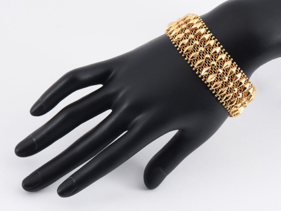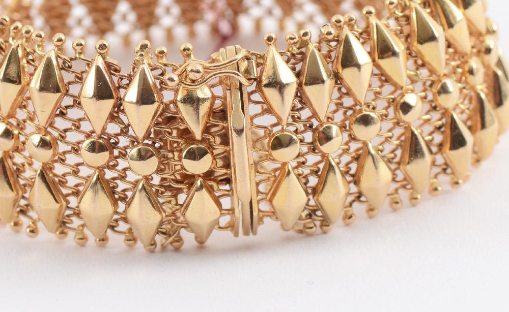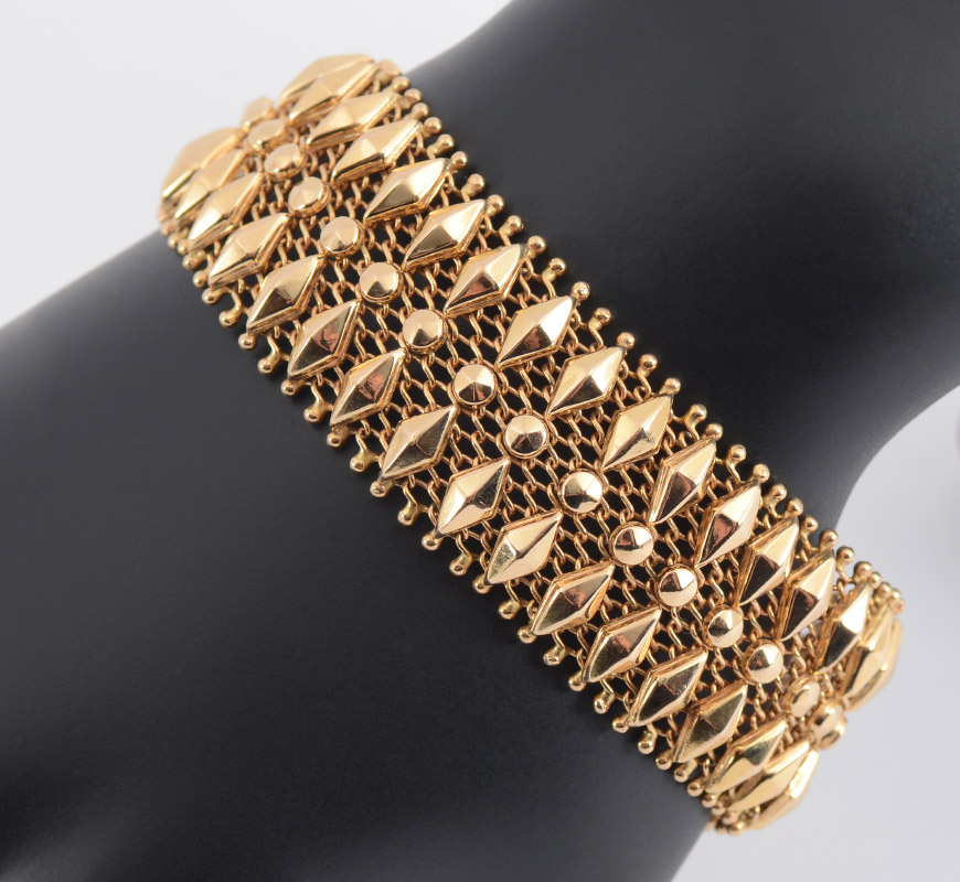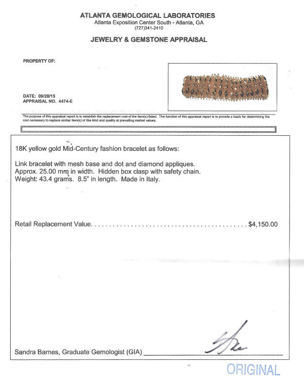 HIGH STYLE 18K GOLD ITALIAN BRACELET Ca. 1940's: Mesh base link bracelet with dot and diamond appliques. Width 25 mm, length 8.5''. Weight 43.4 grams. Sold with current Atlanta Gemological GIA graduate's appraisal for $4150.