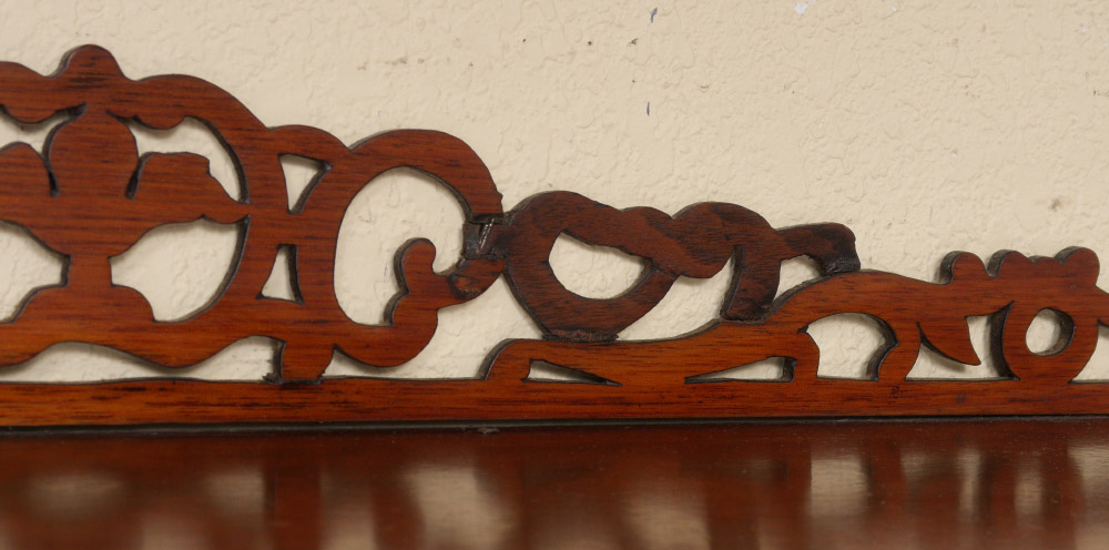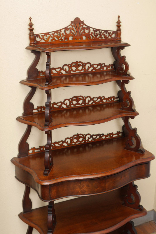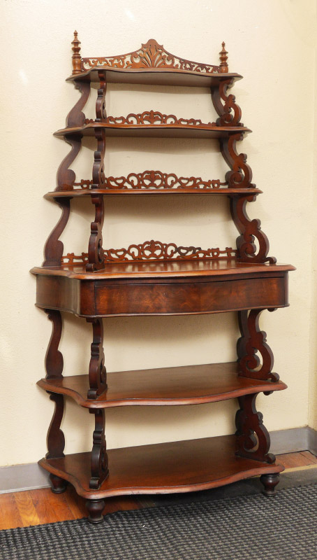 VICTORIAN SERPENTINE ETAGERE: 3 graduated serpentine shelves with carved and pierced backsplash, carved supports, over single central drawer. 2 lower open shelves, all on turned feet. 68'' h. x 37 1/2'' x 17''.