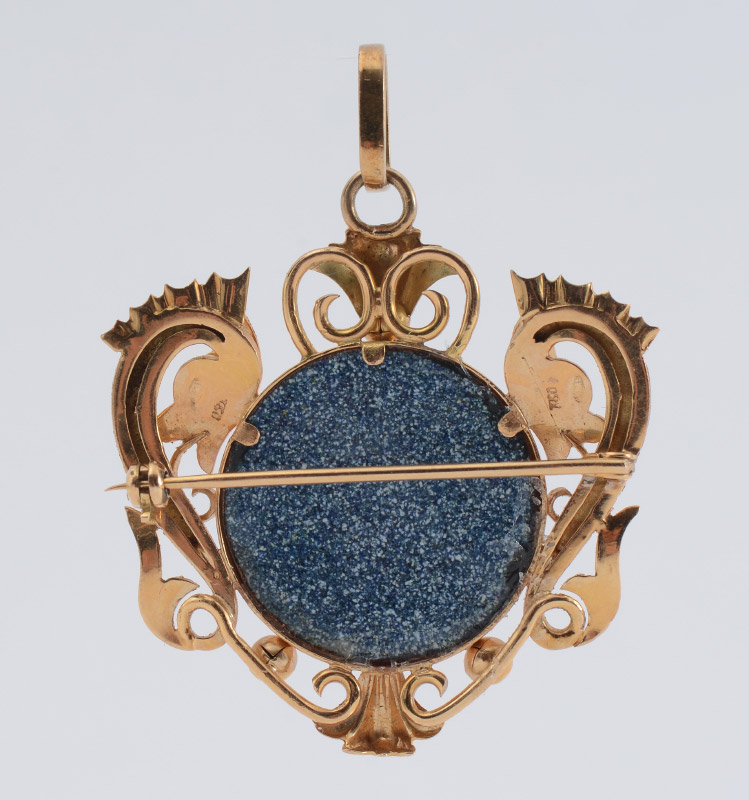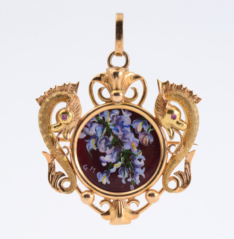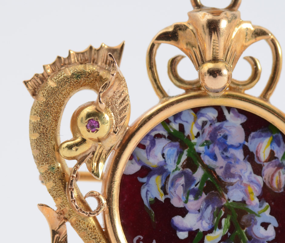 18K ENAMEL DRAGON MOTIF PENDANT BROOCH: 18K yellow gold pendant of two dragons guarding over a floral motif enamel disc. Two 1.00 mm rubies are deep set as the dragon's eyes. Bar pin closure and bail. Measures 1.5'' x 1.5''. Weight: 11.9 grams.