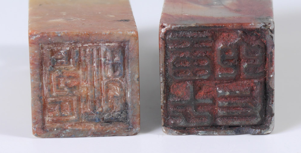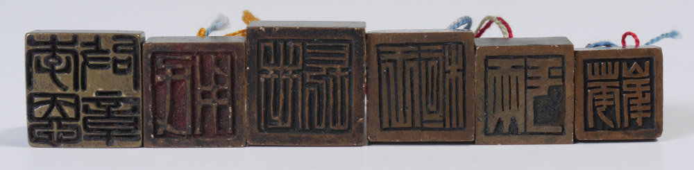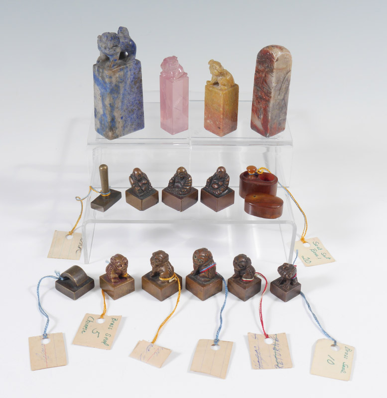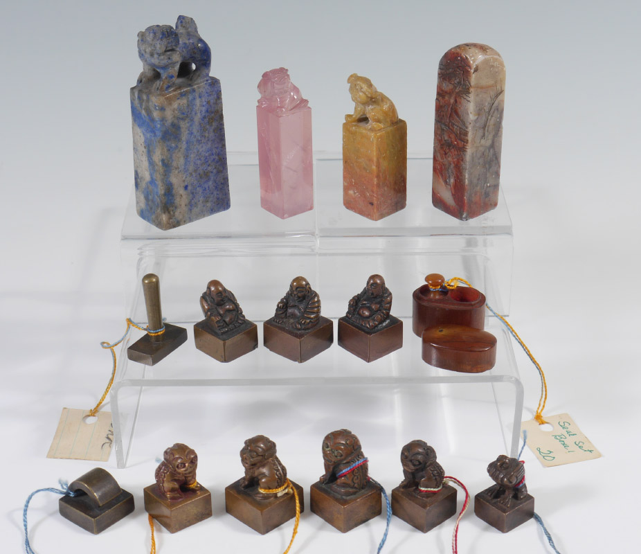 COLLECTION OF 15 CHINESE CHOP SEALS & SCROLL WEIGHTS: An assembled collection of 15 seals to include bronze, brass and various carved stone. Tallest measures 3 1/8'' h.