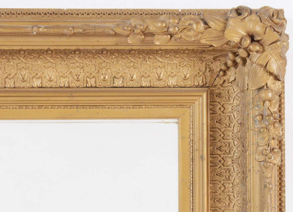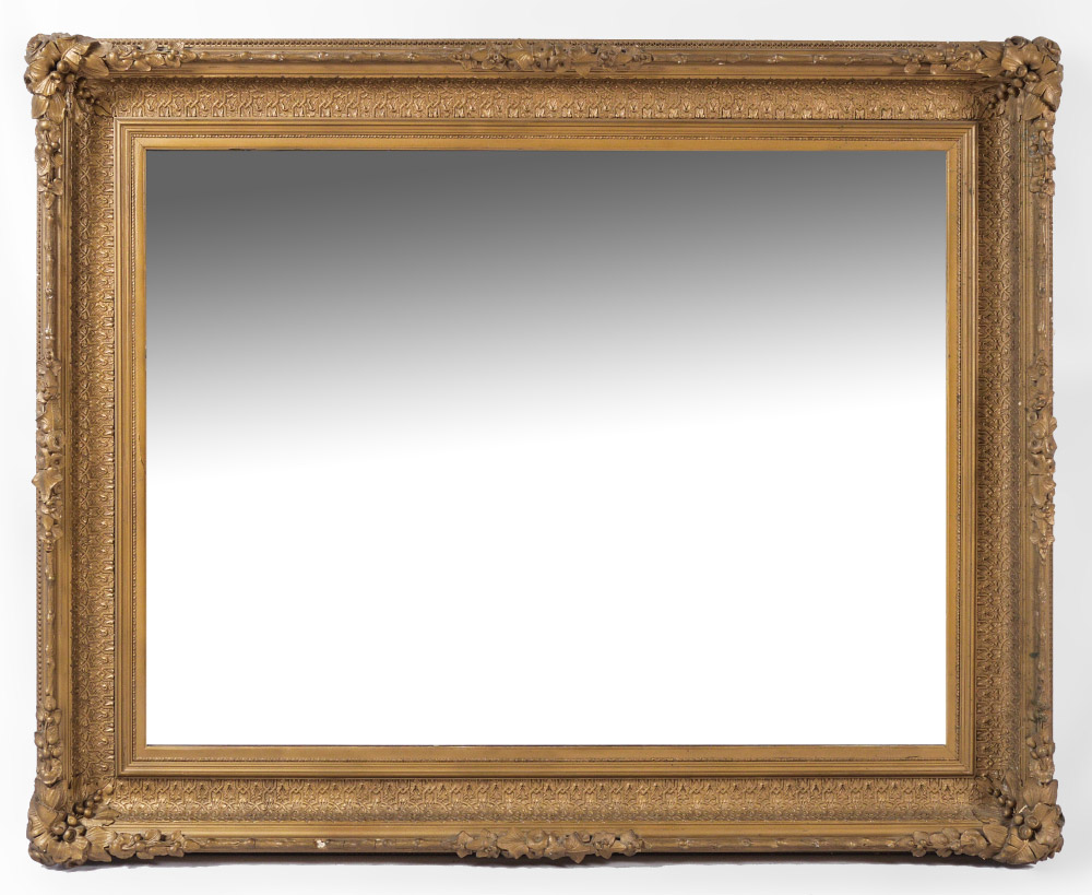 CARVED GILT WOOD WALL MIRROR: Floral motif carved gilt wood frame, measures 46'' x 58'' x 4 1/2''. Holds a 34 1/2 x 46 1/2'' mirror or painting.