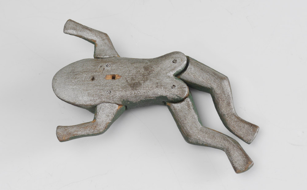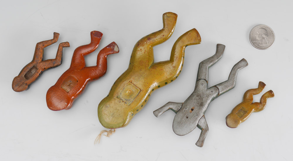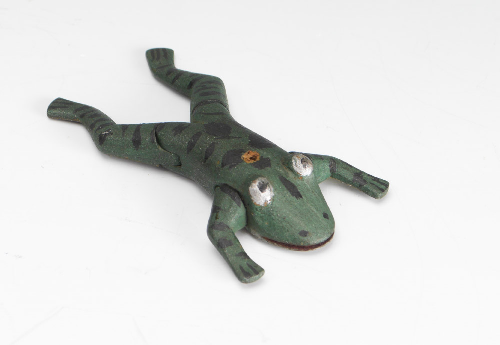 5 CARVED AND PAINTED FROG DECOYS: 5 pieces total with the larges measures 4 3/4''. Unmarked, one with articulated legs, another missing weight.