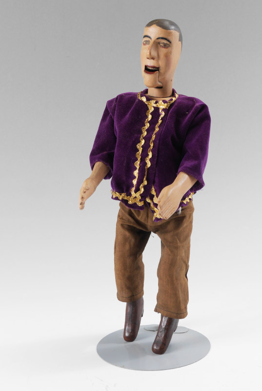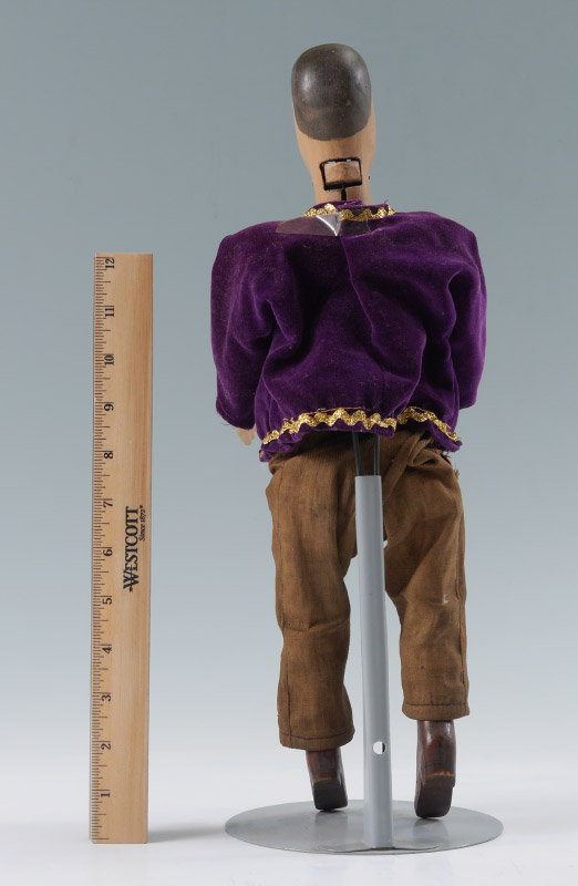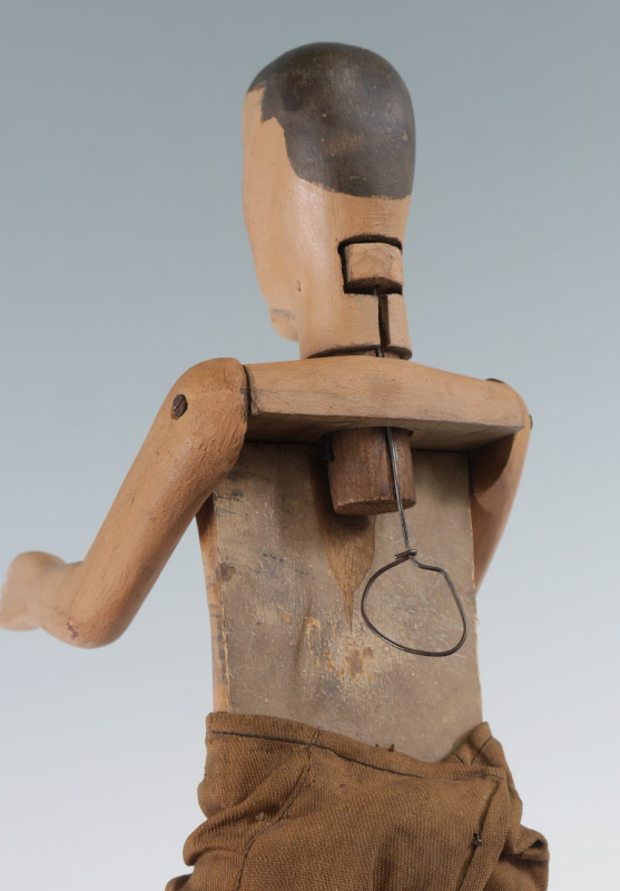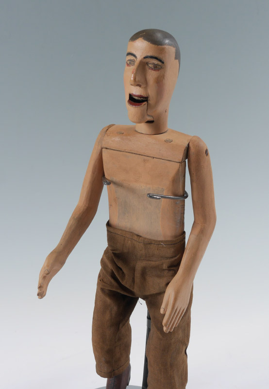 CARVED WOOD FOLK ART VENTRILOQUIST DUMMY: Diminutive in stature, articulated head, mouth moves by hard wire, articulated arms and legs, overall measures 16 1/2'' h. x 6''.
