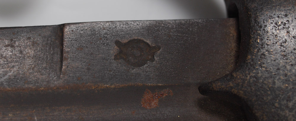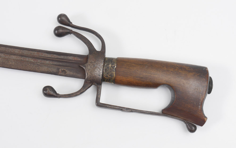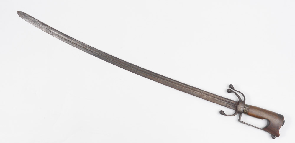 18TH CENTURY MOROCCAN NIMCHA SWORD: Late 18th to early 19th century, carved horn grip, steel hilt with knuckleguard, 3 downturned quillions. Double fuller 33 1/2'' blade with slight curve, clip point tip, unknown hallmark. Overall measures 40'' long.