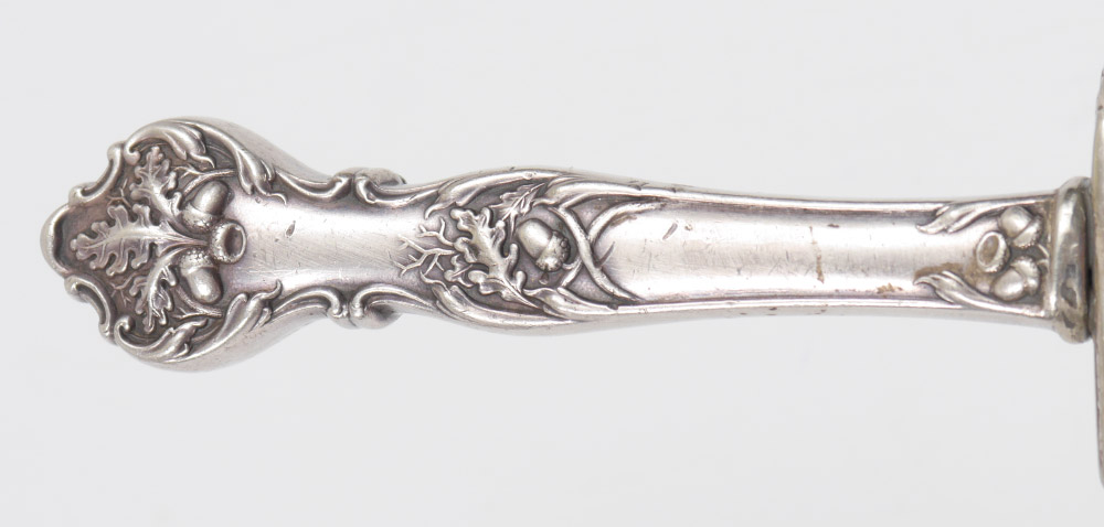 CIVIL WAR ERA SHEFFIELD SILVER HANDLE BOWIE KNIFE: Silver grip with oak leaves and acorns motif, 6 3/4'' clip point blade. No sheath. Overall 10 1/4''.