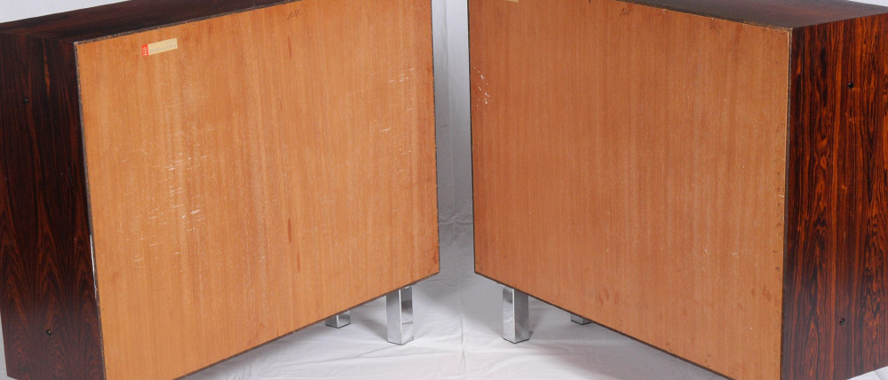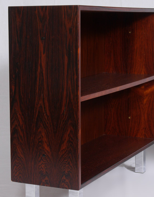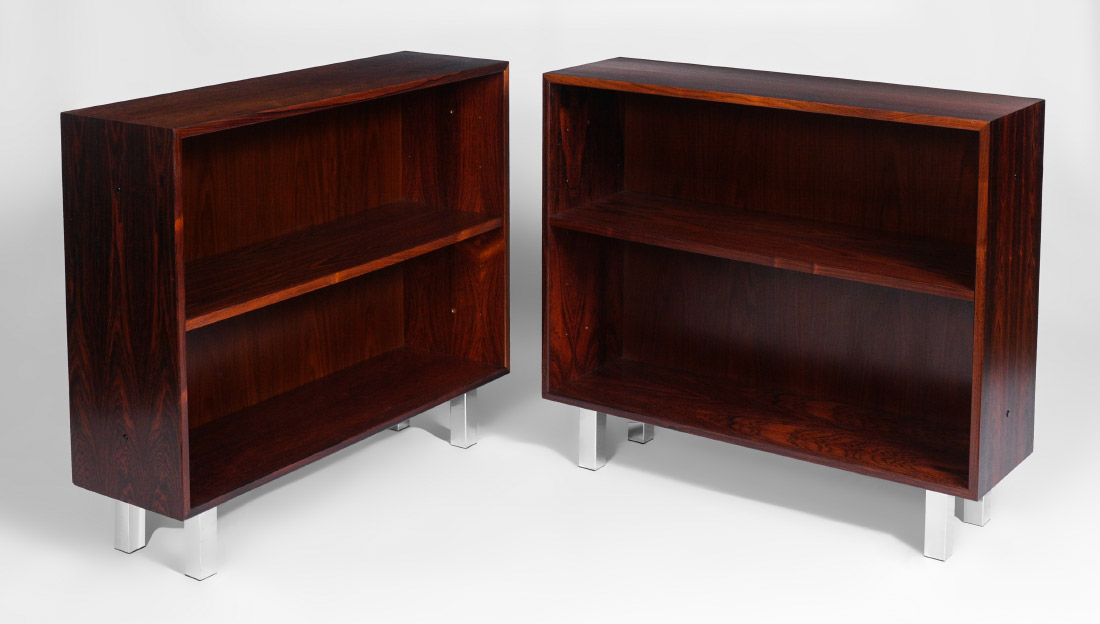 PAIR OF DYRLUND ROSEWOOD DANISH MODERN BOOKCASES: Each with a single shelf, on chrome legs, Dyrlund Smith tag on back of one. Measure 28 1/2'' h. x 33 3/4'' x 10 1/4''.