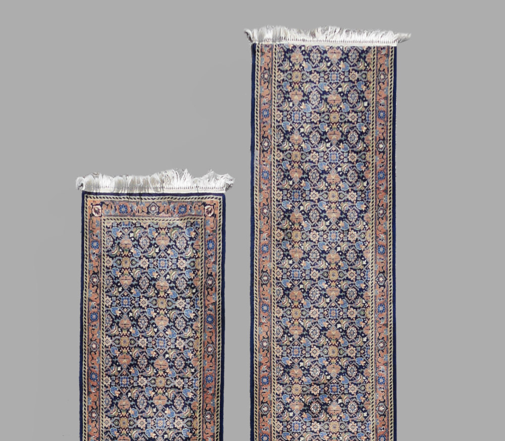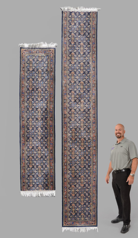 APPROX 20-30 YR. OLD INDO-PERSIAN HAND KNOTTED WOOL RUNNERS, 2'7'' X 8'9'' & X 13': These runners are actually one very long runner that was adapted to fit the needs of the owner. The deep blue field is covered with an overall repeating Herati pattern done in shades of blue, white, pale yellow, and peach. Each runner has an end that has been fringed but does not have the borders that normally would be there. However, your eye does not go right to it.