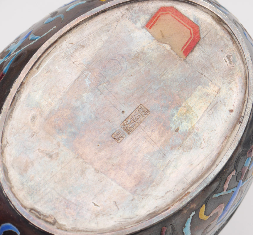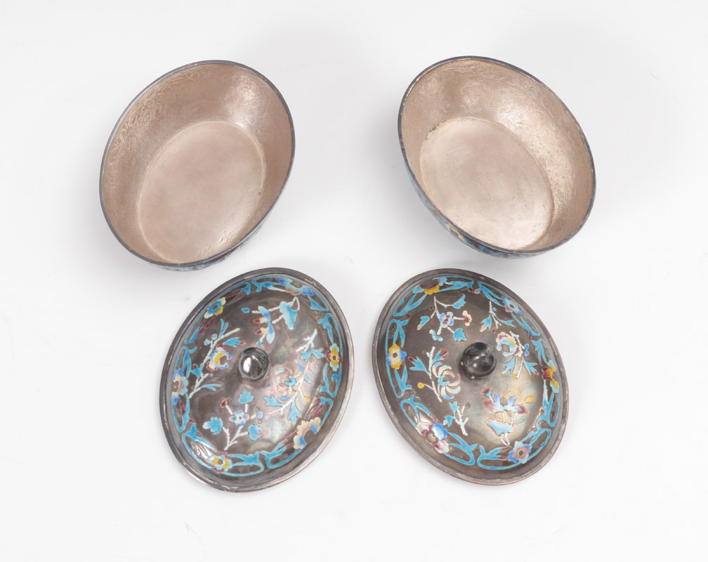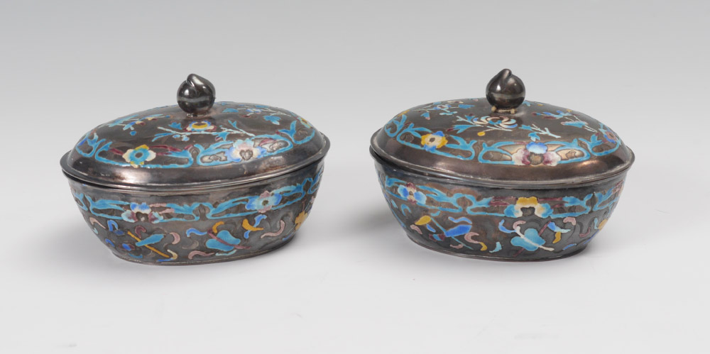 PAIR CHINESE EXPORT SILVER ENAMELED COVERED BOXES: Oval boxes with removable lids, engraved and accented with floral motif enamel decoration. Unknown maker / dealer marks on base. 3'' h. x 4 1/2''. Approx. 7.8 troy oz.