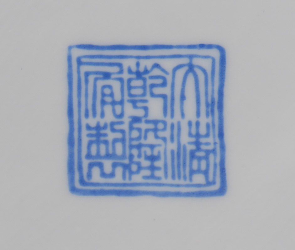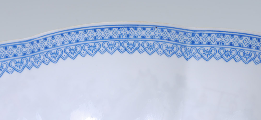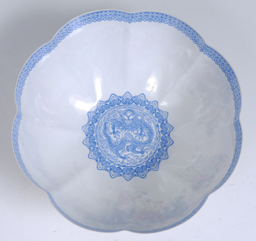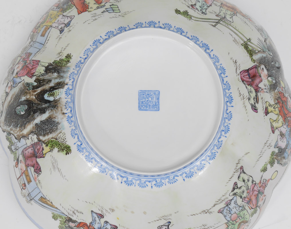 CHINESE EGGSHELL PORCELAIN CENTER BOWL: Scalloped rim and body, rime with blue geometric decoration, interior center dragon motif medallion. Exterior with outdoor genre scenes of children at play. Marked on base with spurious Qianlong archaic seal mark. 4 3/4'' h. x 11 1/4''.