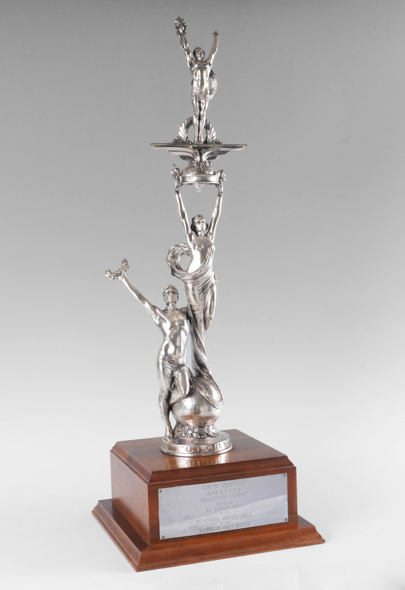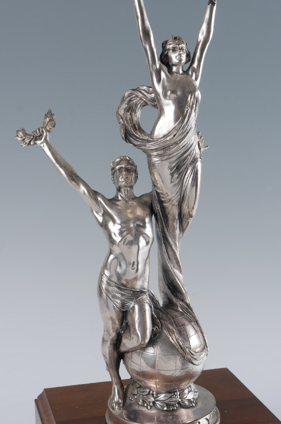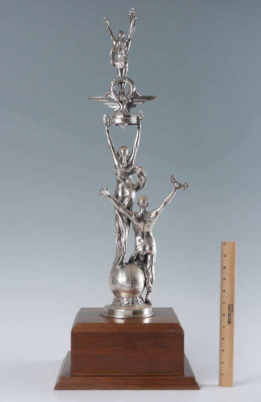 LARGE WEIDLICH BROTHERS DANCE COMPETITION TROPHY: Mid 20th century silvered trophy with 3 figures. On wood base with plaque dedication ''North American Amateur Challenge Trophy, Presented by Al Ross of NBC to the Outstanding Amateur Couple of the Washington Dance Festival''. Overall measures 33'' h. x 12'' x 12''.