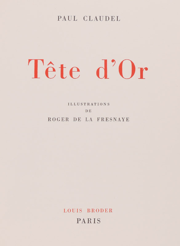 CLAUDEL, Paul (French, 1868-1955): ''Tete D'Or'', published by Louis Boder, Paris, 1950. Illustrated by Roger de la Fresnaye. Sold with original slipcase 2'' h. x 13 3/4'' x 10 1/2''.