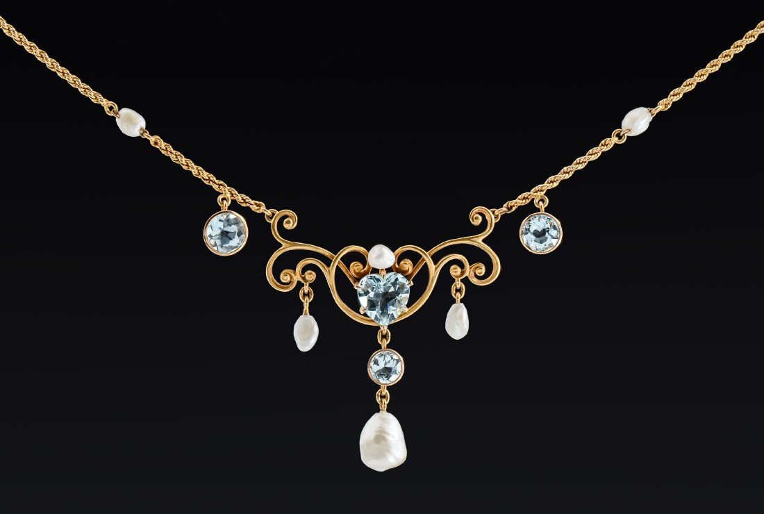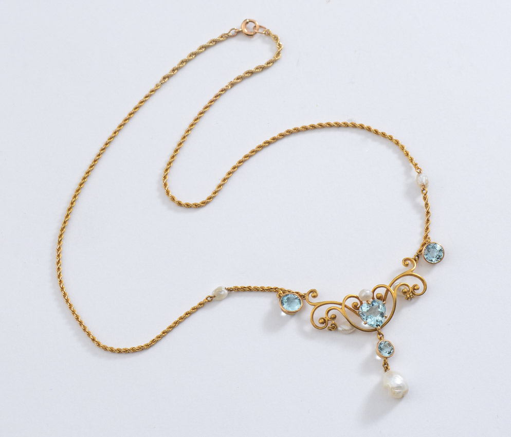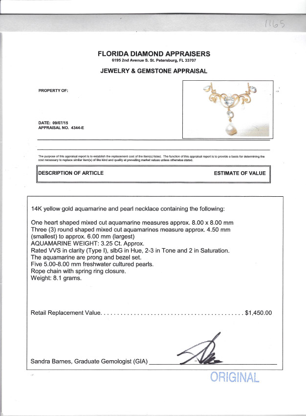 AQUAMARINE AND PEARL LAVALIER NECKLACE: 14K yellow gold necklace featuring a heart shaped and 3 round mixed cut aquamarines totaling approx. 3.25 Ct. The five fresh water seed pearls are 5-8mm. Measures 16'' length. Sold with current Florida Diamond Appraisers GIA graduates appraisal for $1,450.