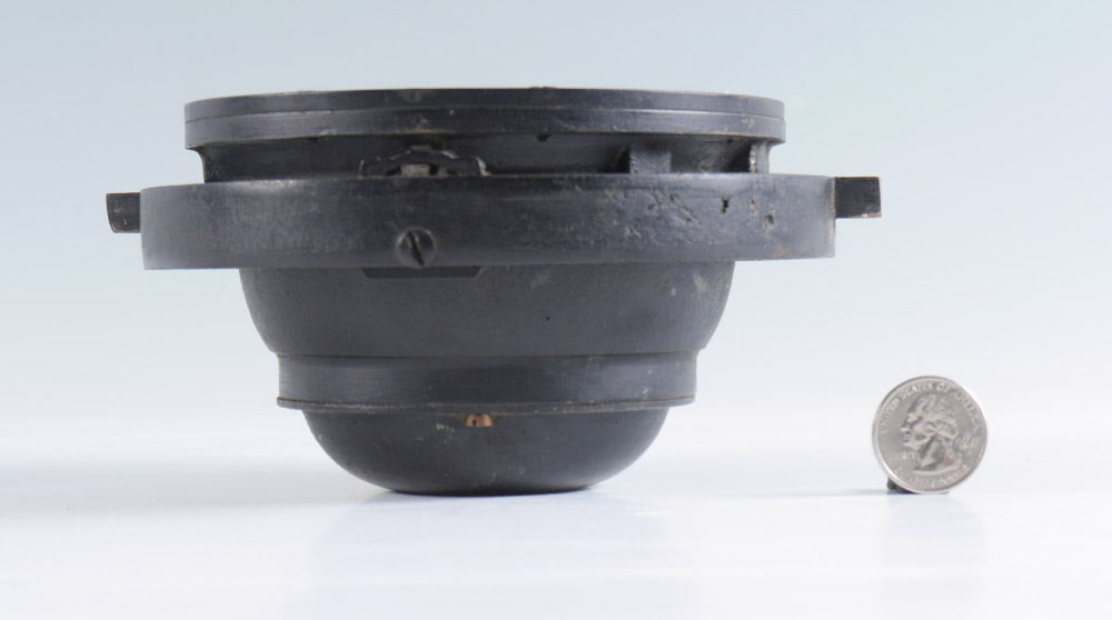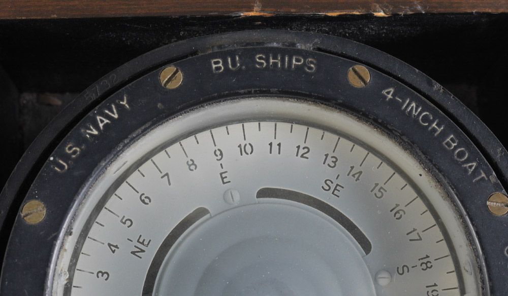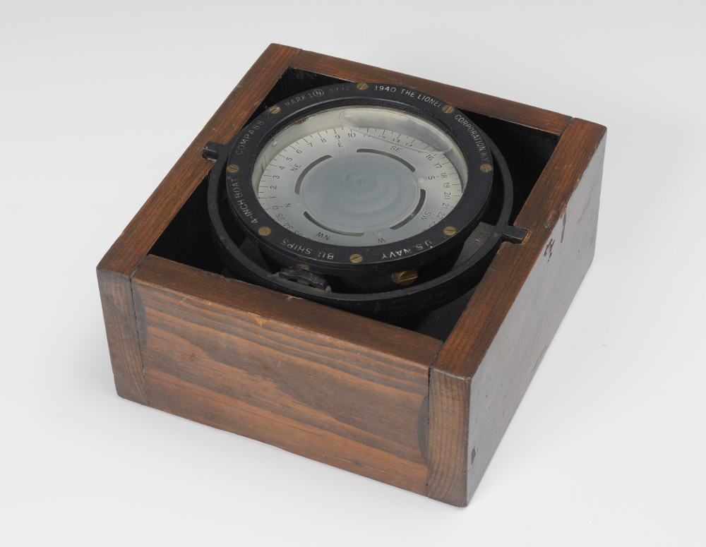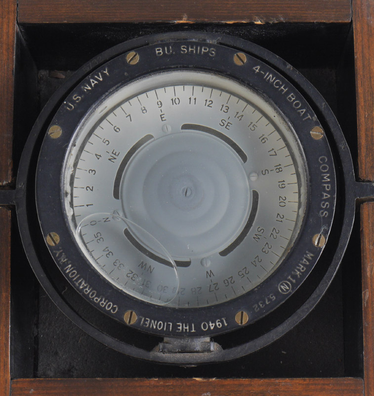 LIONEL MARK 1 US NAVY SHIPS COMPASS: Double gimble black metal case, well marked ''U. S. Navy, BU. Ships, 4-Inch Boat Compass, Mark 1 N 5732, 1940 The Lionel Corporation''. Sold in a wood box, overall 4 1/2'' h. x 7 3/4'' x 7 3/4''.