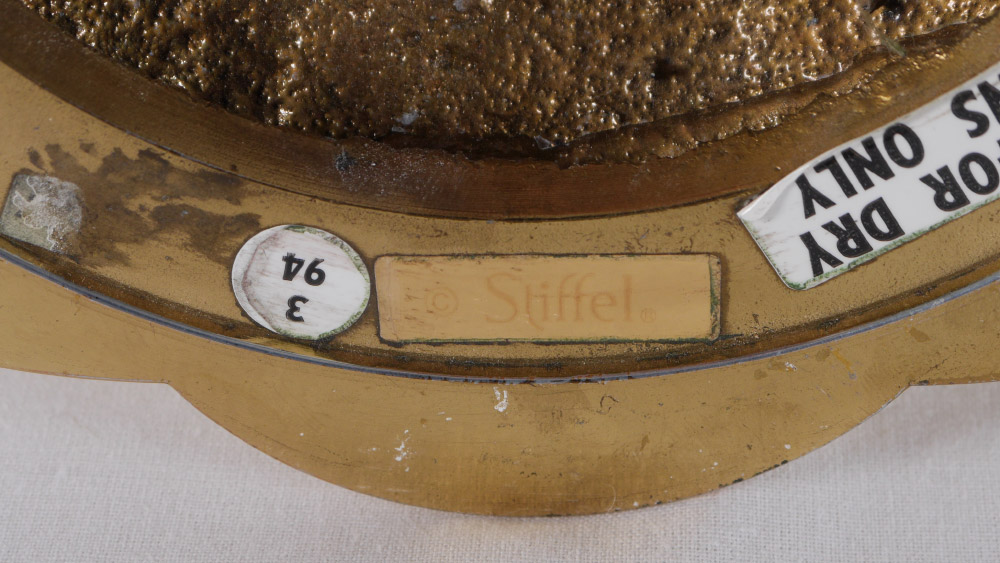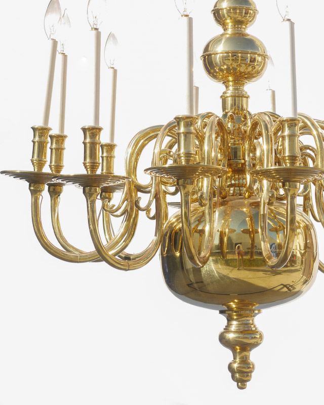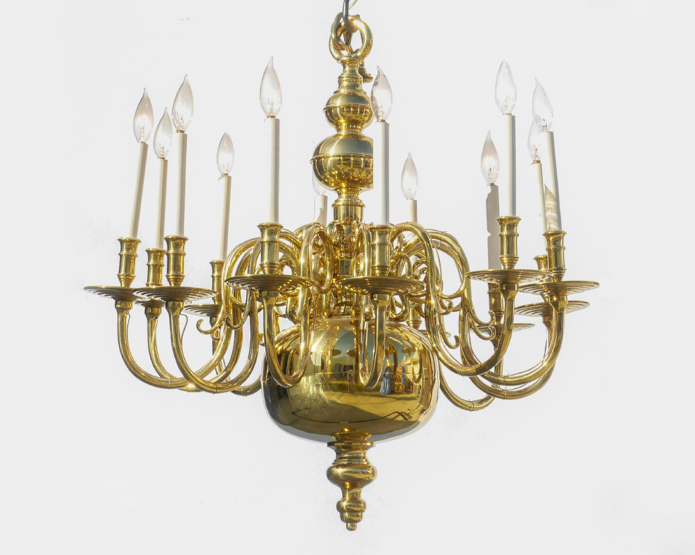 STIFFLE BRASS 12 LIGHT CHANDELIER: Graduating bulbous brass globes, 12 arms. Stiffle label on ceiling cap. Overall measures 31 1/2'' h. x 31''.