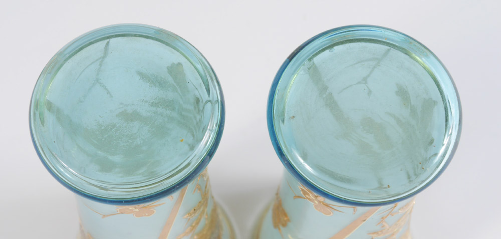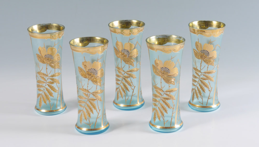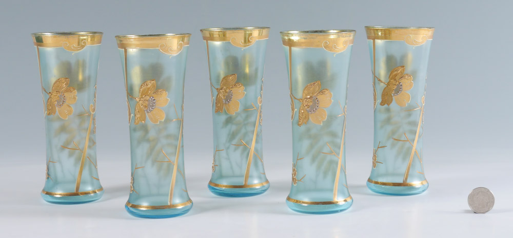 5 MONT JOYE ENAMELED ART GLASS TUMBLERS: Applied gilt enamel floral and fern decoration, attributed Mont Joye, light blue glass, unmarked, 6 1/2'' h. x 2 3/4''.