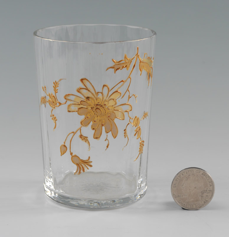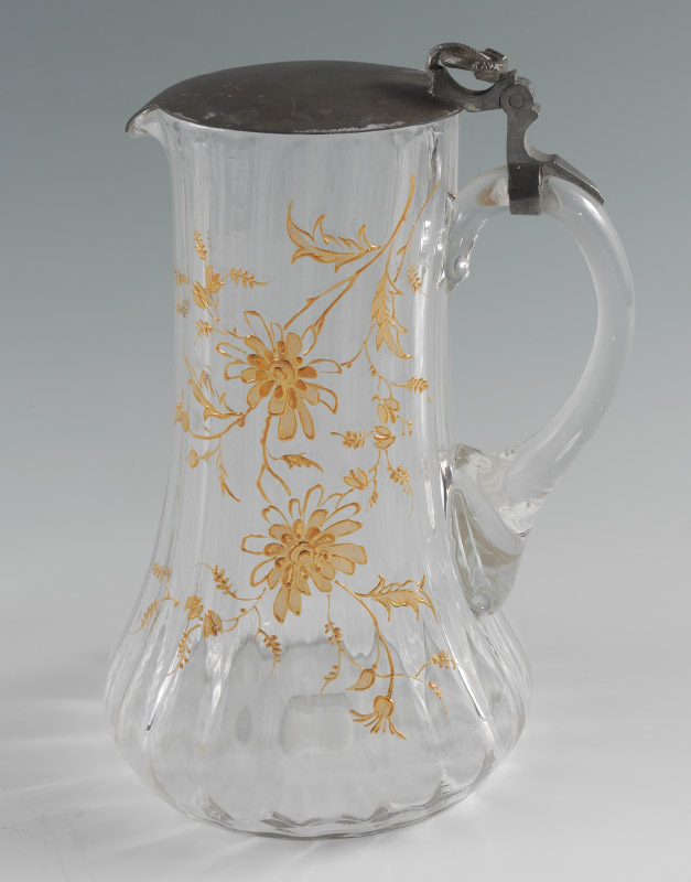 FLORAL ENAMELED GLASS WATER SET: 5 pieces total, unmarked with gilt enamel floral decoration to include 1) Ribbed water pitcher with hinged pewter top, flared base, measures 9'' h. x 6 1/2''. 2-5) 4 ribbed water glasses, 3 3/4'' h.