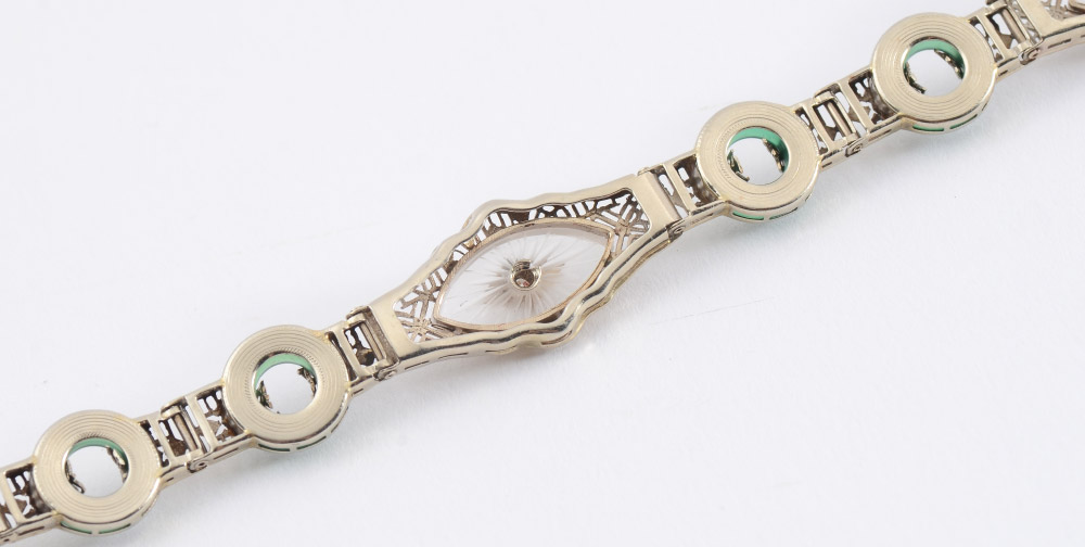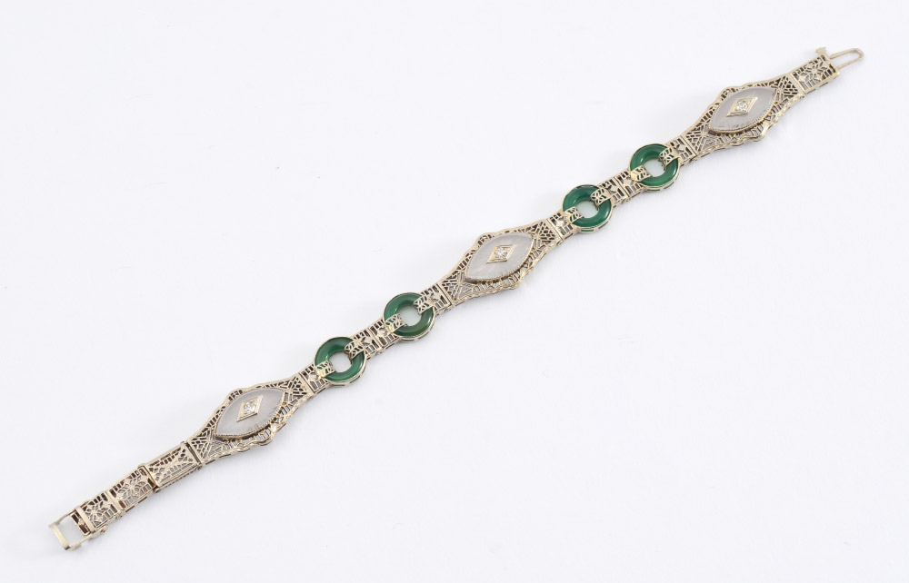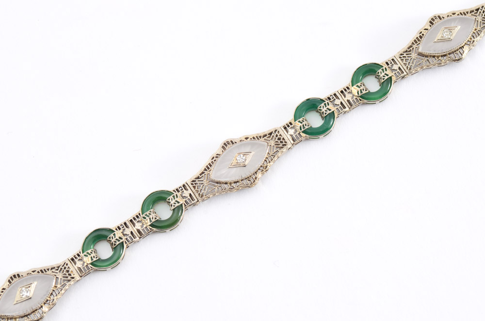 14K ART DECO FILIGREE BRACELET: 14K white gold filigree bracelet with 4 disc shaped pieces of green chrysoprase, 3 navette shaped carved rock crystal pieces and 3 round single cut diamonds. Diamonds total approx. .15 ct., are rated VS in clarity and G-H in color. The diamonds are prong set. Locking closure with hidden hinged safety clasp. Length 7.5''. Weight: 13.3 grams.