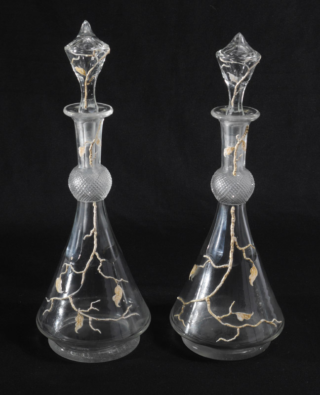 MOSER ENAMELED GLASS LIQUEUR DECANTER SET: 9 pieces total to include 1-2) Decanters signed on the base with enameled stylized branch and leaf motif, marked on base with pre-1938 Moser mark. 12'' h. x 4 1/4''. 3-8) Six cordial glasses with matching decoration, 5 1/2'' h. 9) Matching trim on tray, 1'' x 14 3/4'' x 11''.