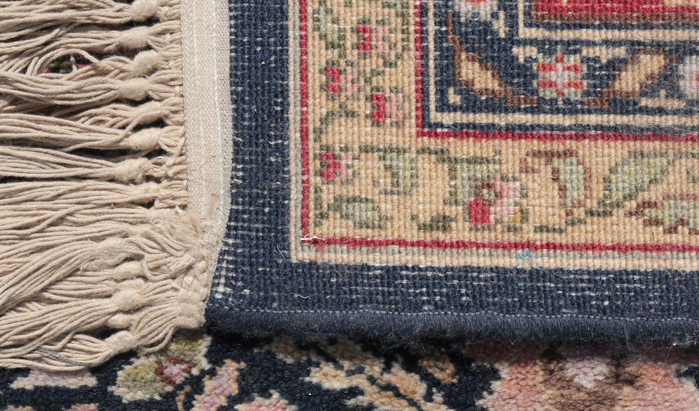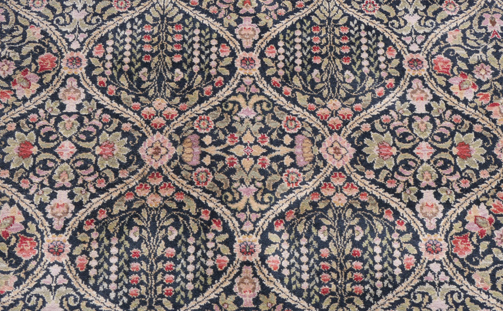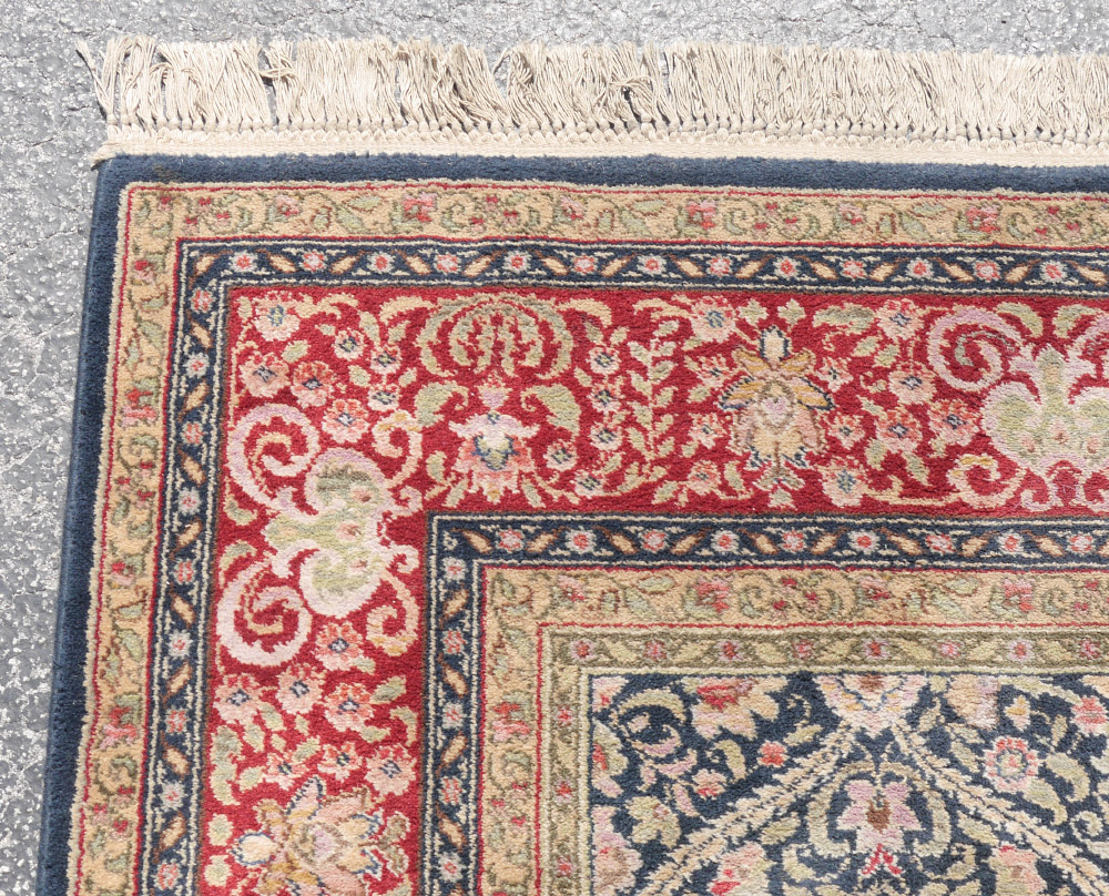 APPROX 20-25 YR. OLD AMERICAN MACHINE MADE KARASTAN WOOL RUG, 8'6'' x 12'1'': This fine Karstan has a diamond shaped grid-work garden pattern. In each diamond are found various flowers and leaves done in shades of red, pink, lavender, and green. The main border of the rug has a red ground and the four guard borders. The two guard borders have contrasting light and dark grounds that help to frame the field.