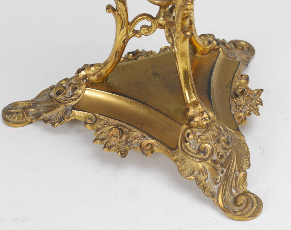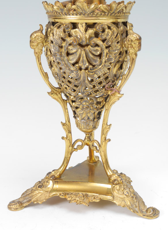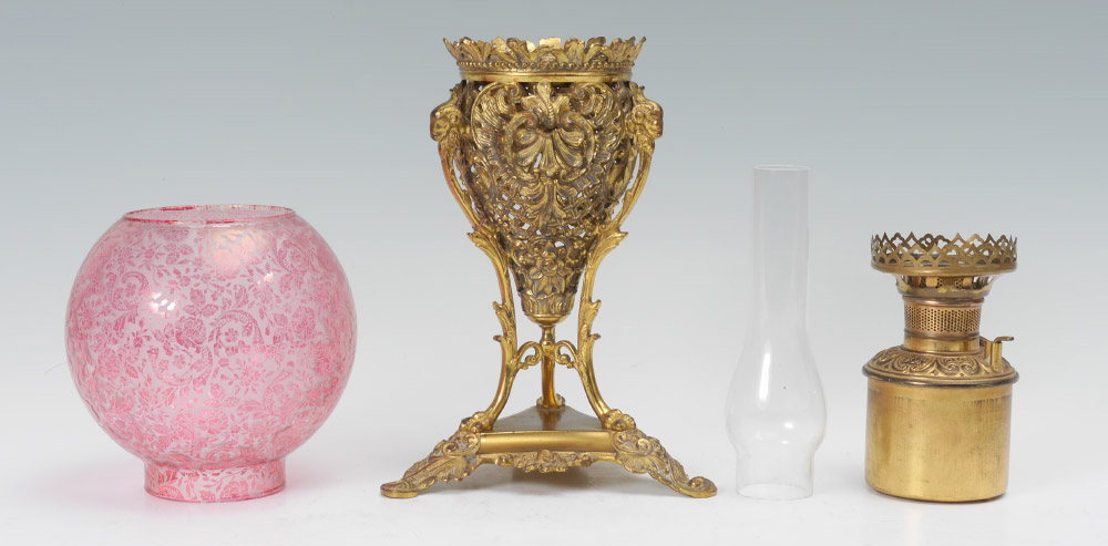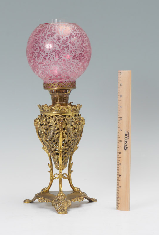 BRADLEY & HUBBARD CRANBERRY OIL LAMP: Rococo style open work gilt cast metal base with rams head decoration. Single font with B & H cap, overall measures 11 1/4'' h. x 6''. Cranberry glass shade with flashed floral decoration, 5 3/4'' x 5 1/2'', fitter rim 2 7/8'', clear 6 5/8'' chimney