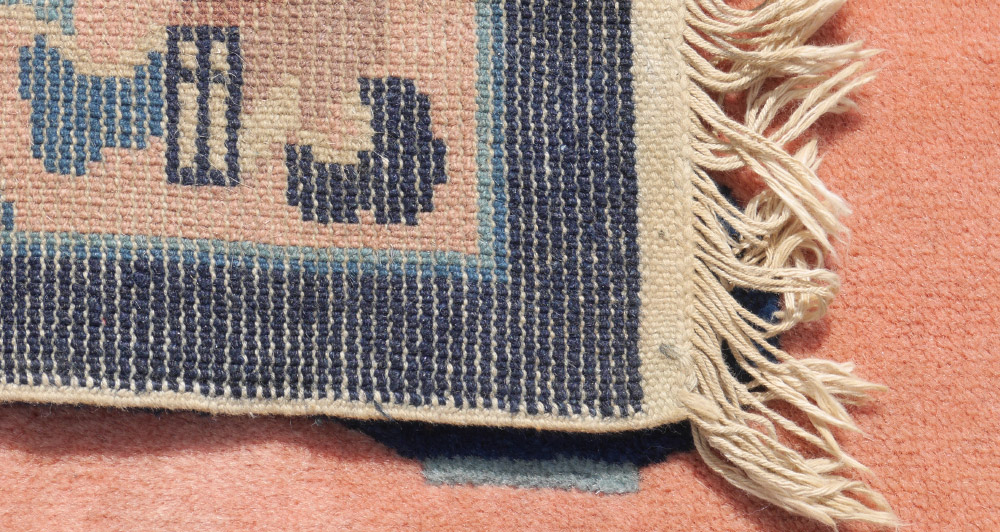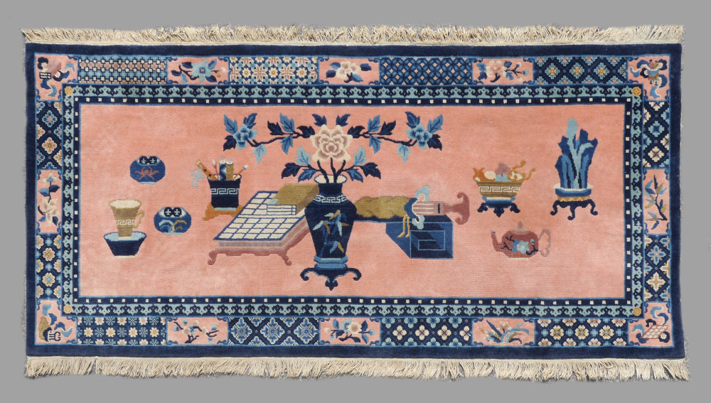 APPROX. 20-30 YR. OLD CHINESE HAND KNOTTED WOOL RUG, 3'4'' x 7'4'': This interesting pictorial rug has a pale peach colored field that has various items that would be found in the home of a scholar or sophisticated Chinese man. Books, vases of flowers, a pot of brushes for painting or calligraphy and so on. The multi shades of blue borders are broken up by small peach colored panels with floral designs. Condition is good with some slight soiling.