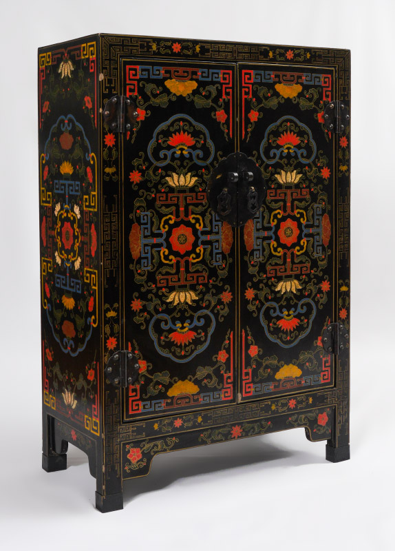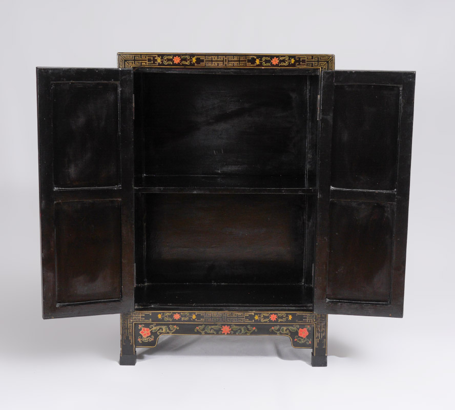 CHINESE POLYCHROME DECORATED LACQUER CABINET: Polychrome floral and geometric decoration over black lacquer 2 door cabinet with single shelf. Shaped skirt, on 4 legs, overall measures 36 1/4'' h. x 24'' x 12 1/2''.
