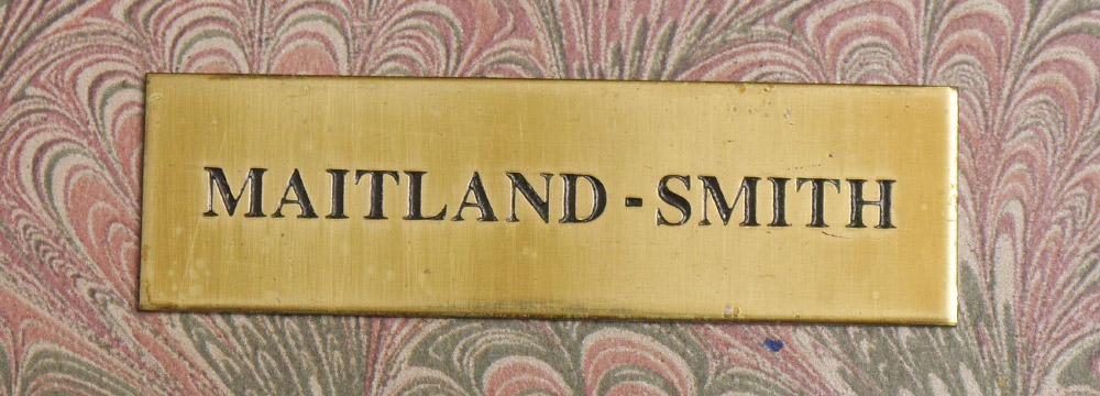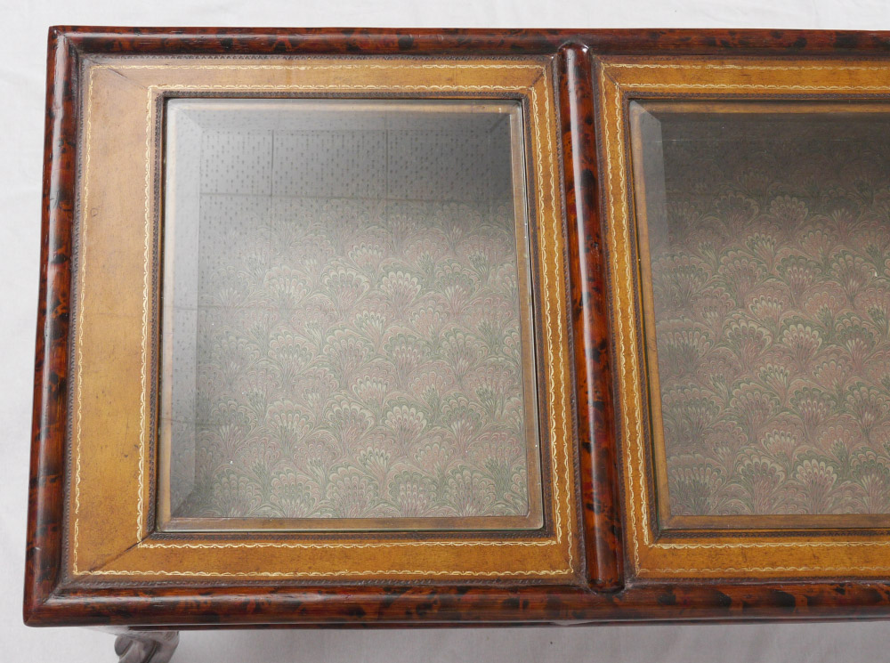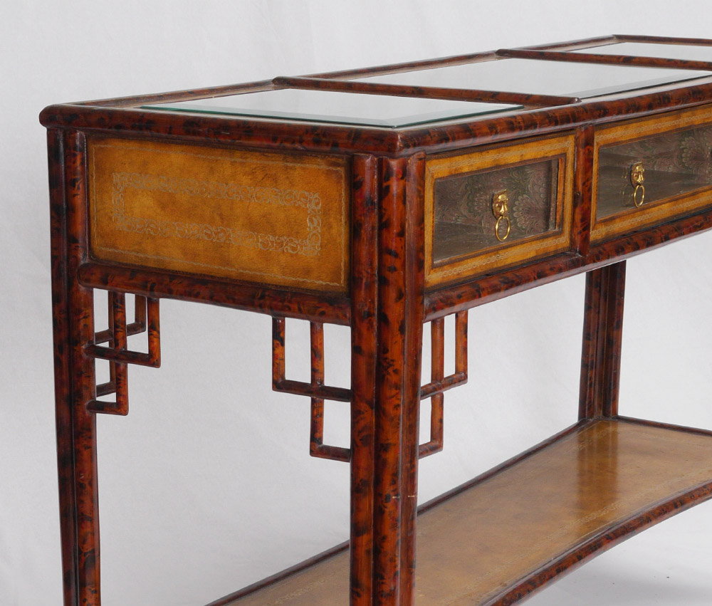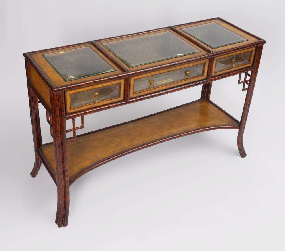MAITLAND SMITH VITRINE HALL TABLE: Top with 3 sections, beveled glass tops and drawer fronts, lined interior, faux bamboo frame, embossed leather open lower shelf, shaped legs. Overall measures 32 3/4'' h. x 52'' x 20''.