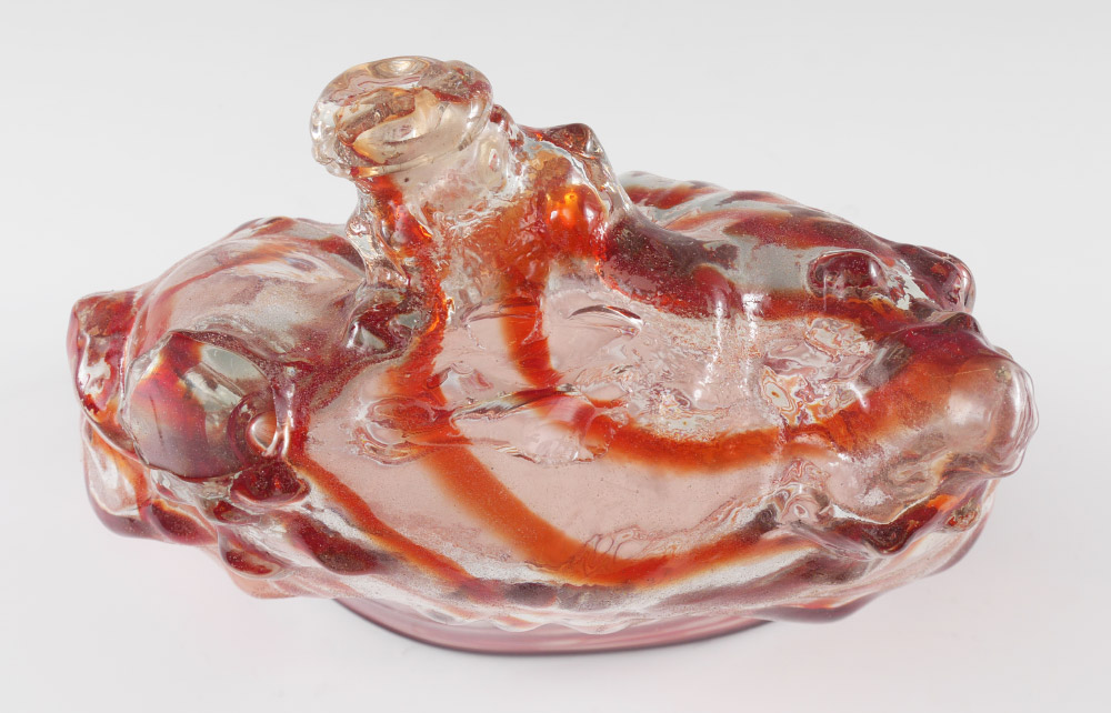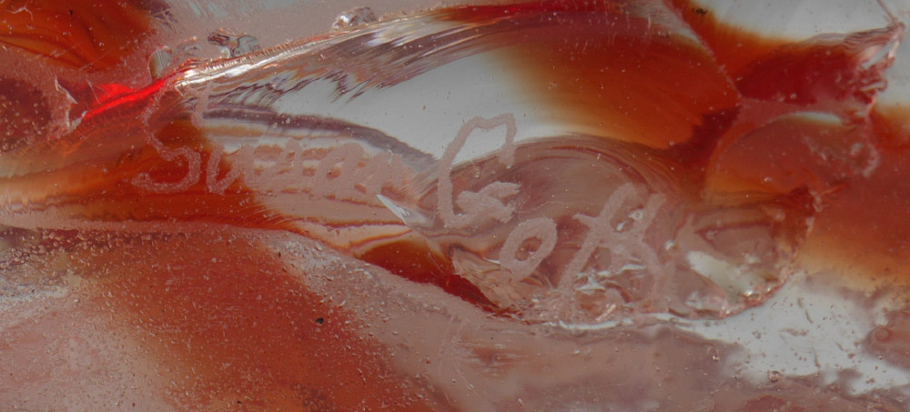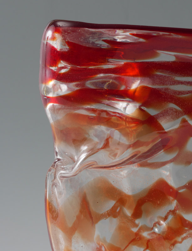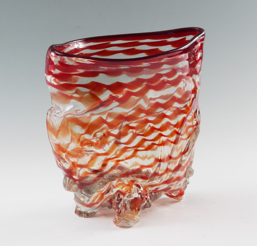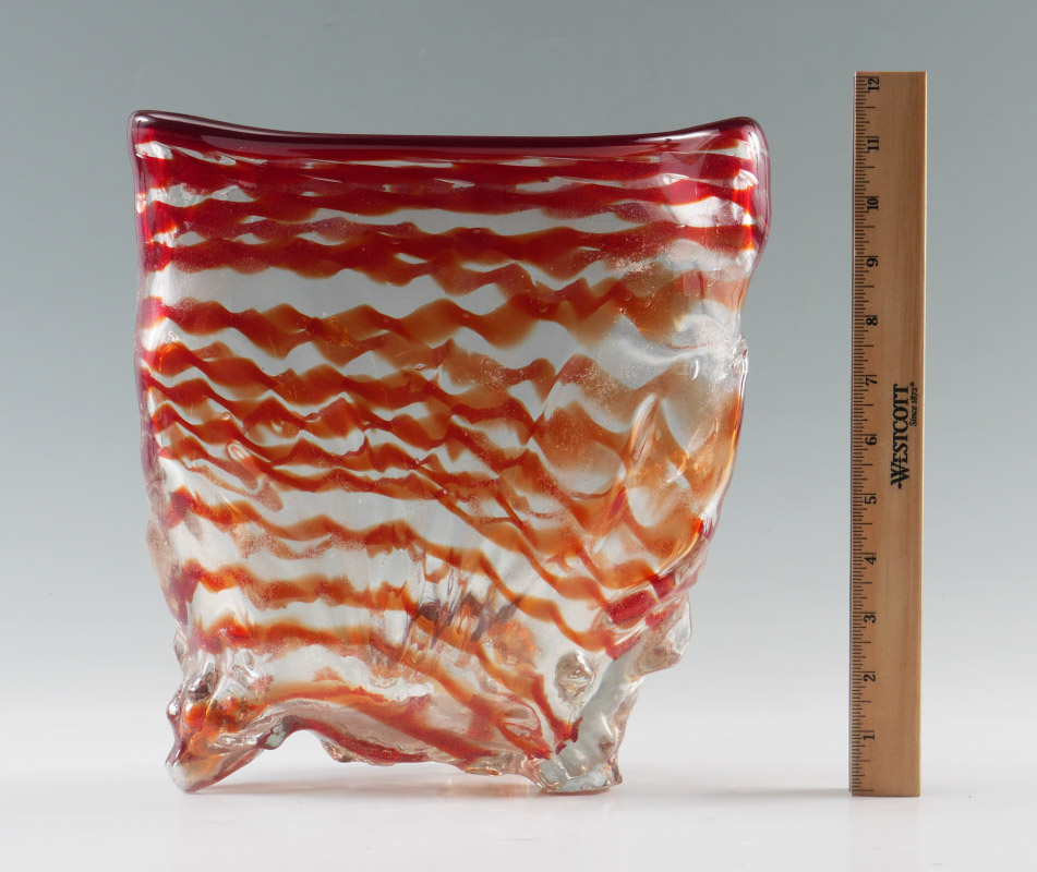 SUSAN GOTT STUDIO ART GLASS VASE: Free form vase with bands of red stripes on clear ground, etched signed on base, overall 11 1/2'' h. x 11'' x 6''.