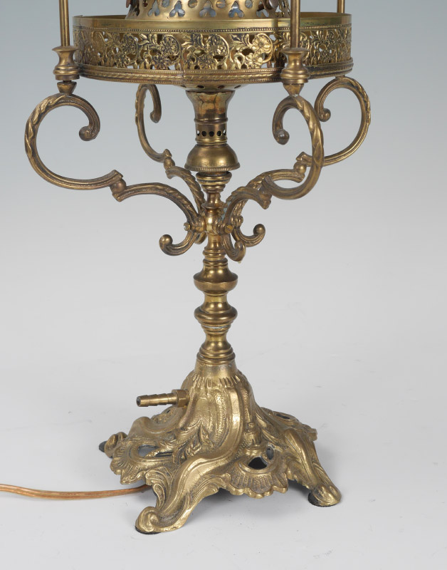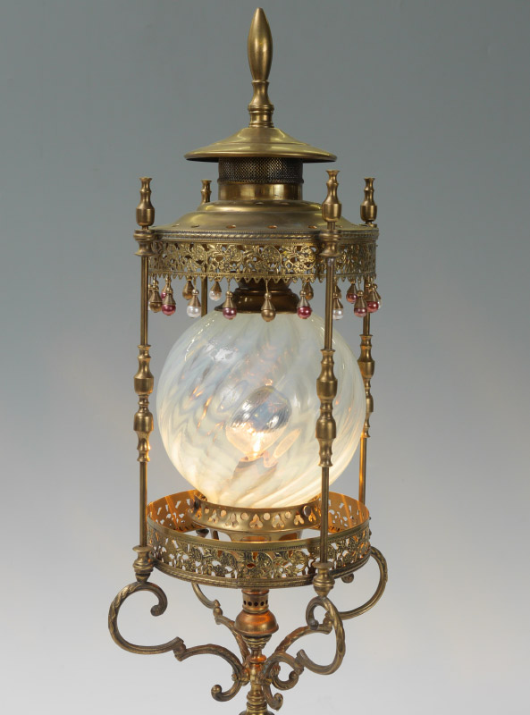 OPALESCENT SHADE GAS TABLE LAMP: Electrified from natural gas, gilt metal foliate scroll base, brass frame with pierced trim, bead drops, spire finial. Internal swirl opalescent glass globe shade. Overall measures 25'' h. x 9''.