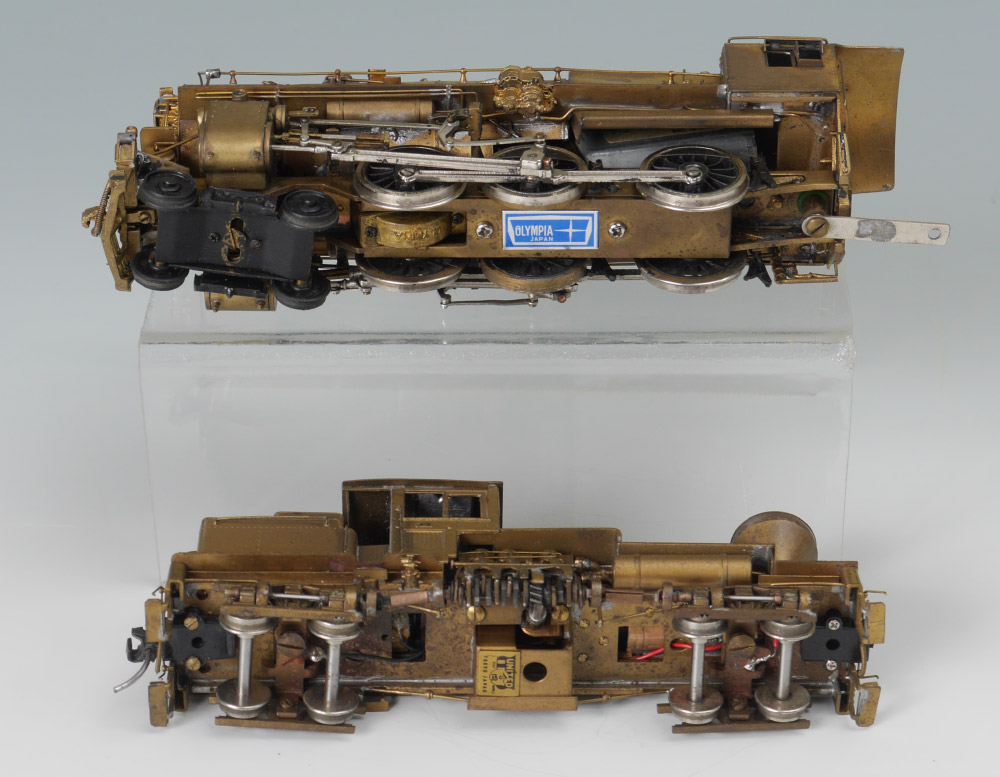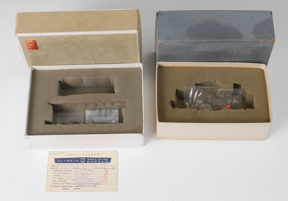 OLYMPIA & UNITED BRASS HO TRAIN ENGINES: 2 Japanese boxed sets to include 1) Olympia Precision Models Pennsylvania RR G5S 4-6-0 engine and coal tender. Locomotive 5 3/4'' long, tender 4 1/4''. Sold with original paperwork and box, 2 1/2'' h. x 8 1/2'' x 6''. 2) Unites Scale Models Hillcrest RR, 25-TonSHAYho, 4-0-4, 5 1/8'' long. Sold with original box, 2 3/4'' h. x 8 1/4'' x 5 1/4''.