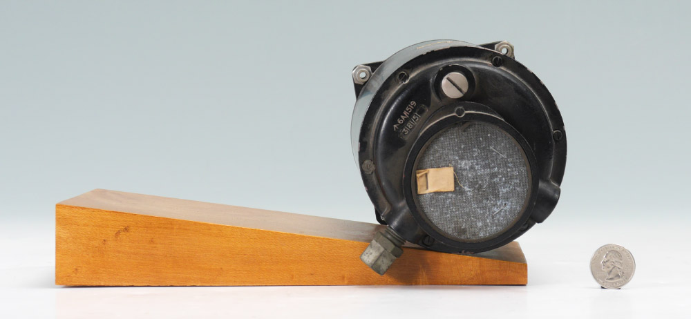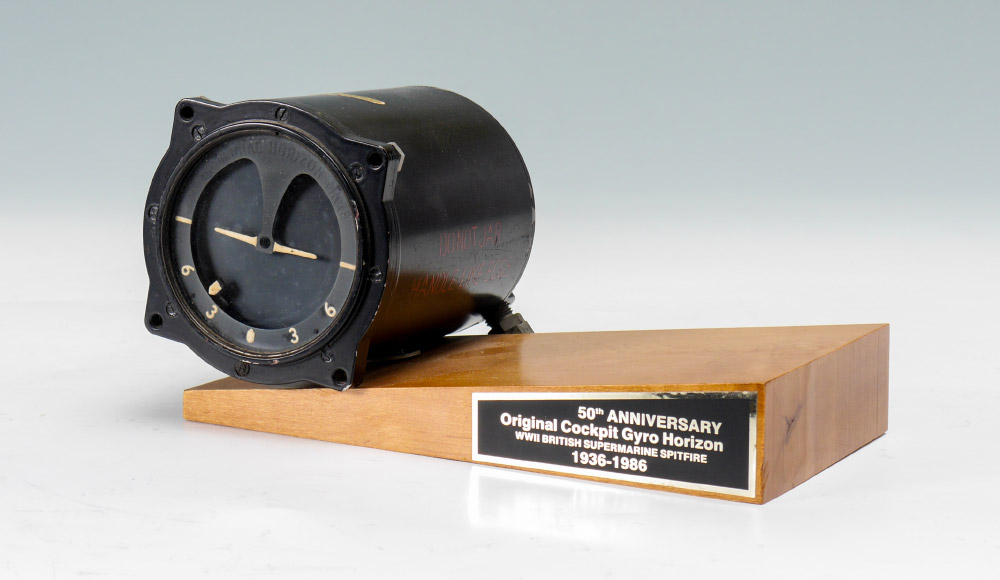 WWII BRITISH SUPERMARINE SPITFIRE HORIZON GYRO: Mounted on wood to celebrate the 50th Anniversary from 1936, original cockpit gyro horizon. Overall measures 5 1/4'' h. x 10 1/4'' x 6 1/2''.