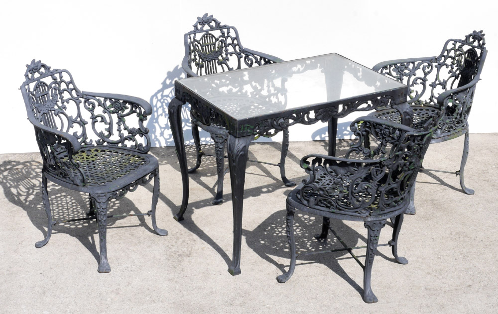 5 PIECE ROBERT WOOD HEAVY CAST IRON PATIO SET: Attributed to Robert Wood Ironworks Ca late 19th C. Seemingly identical chairs found in Woods mid to late 1800's catalog. Set to include 4 arm chairs 31 1/2'' h. x 21 1/2'' x 21 3/4'', and glass top table 28'' h. x 36 1/4'' x 25''. Actual age unknown.