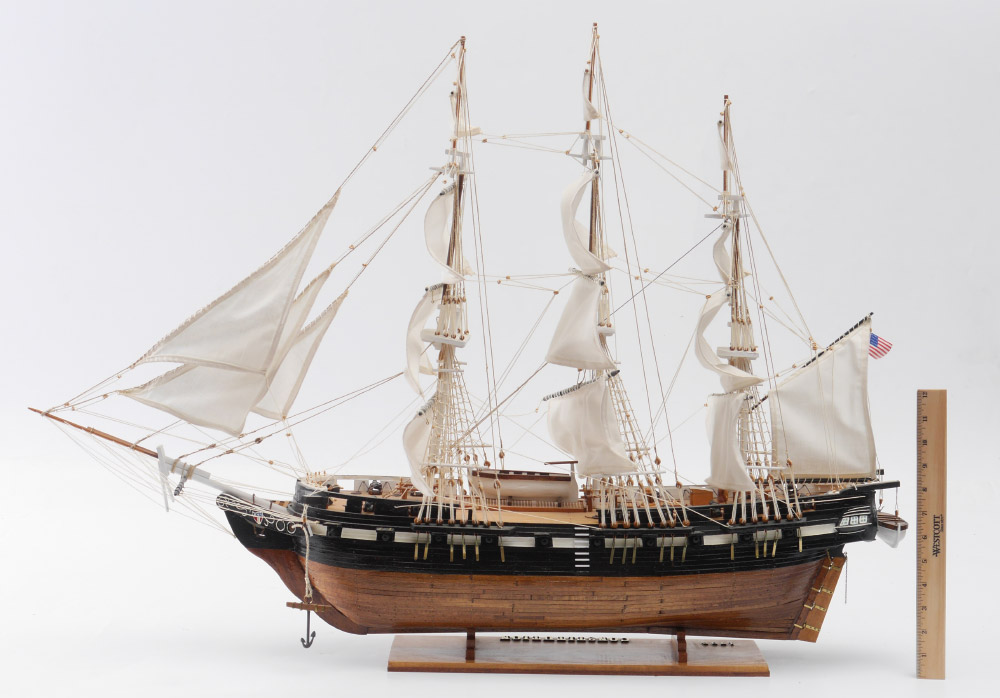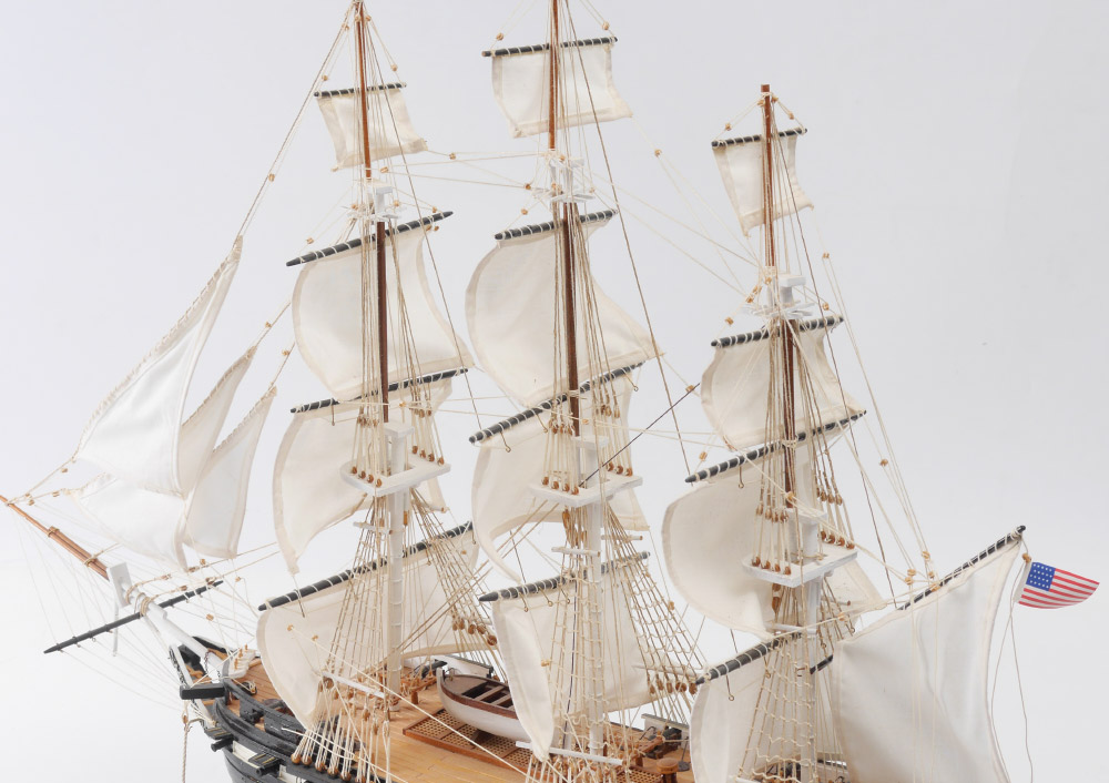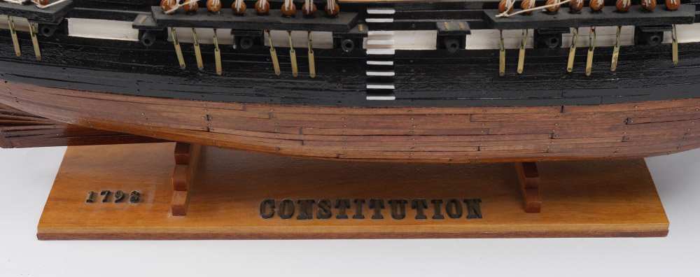 HAND CRAFTED MODEL OF THE U.S.S. CONSTITUTION: Hand crafted by a local artist, nicely detailed model of the tall ship U.S.S. Constitution. Wood, copper, canvas and string construction, measures 27 1/2'' h. x 38'' x 6''.