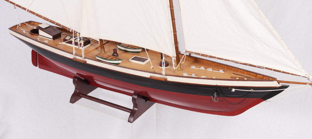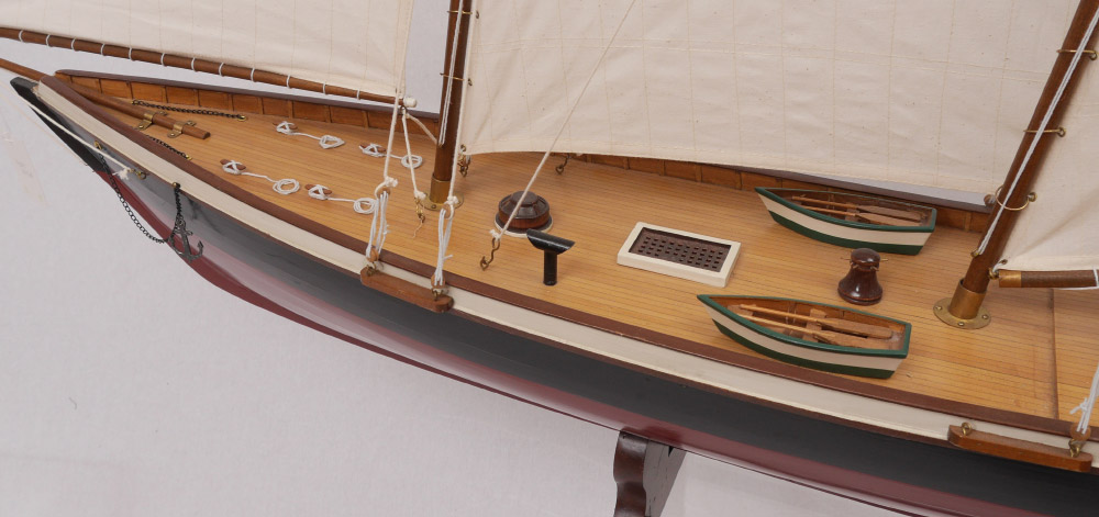 LARGE SCHOONER SHIPS MODEL: Larger than most model of a unnamed schooner, hull painted white over black over red, most likely from a kit. Sold with a wood stand, overall measures 51 1/2'' h. x 54 1/2'' x 9 1/2 on stand.