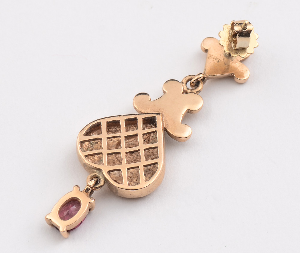 14K GARNET & DIAMOND EARRINGS: 14K yellow gold earrings having two oval faceted garnets totaling approx. 1.00 Ct. and two round brilliant cut diamonds totaling approx. .04 Ct. The diamonds and garnets are prong set. Post and nut closures. Purchased in Ireland. Length 1.75''. Weight: 8.6 grams.