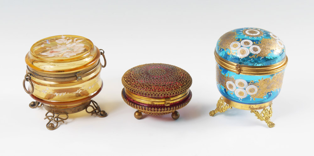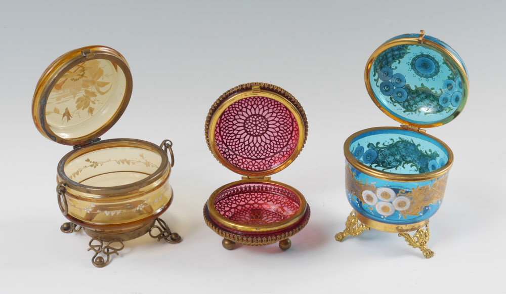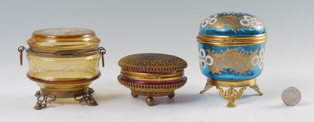 3 PIECE BOHEMIAN ROUND GLASS DRESSER BOXES: 3 pieces total to include 1) Amber enameled glass with metal mounts and feet. 3 1/2'' h. x 4 1/4'' 2) Blue enameled glass with gilt metal mounts and feet, 4 1/2'' h. x 4''. 3) Squat reticulated gilt metal cranberry glass top and bottom, ball feet. 2 1/4'' x 3 1/2''.