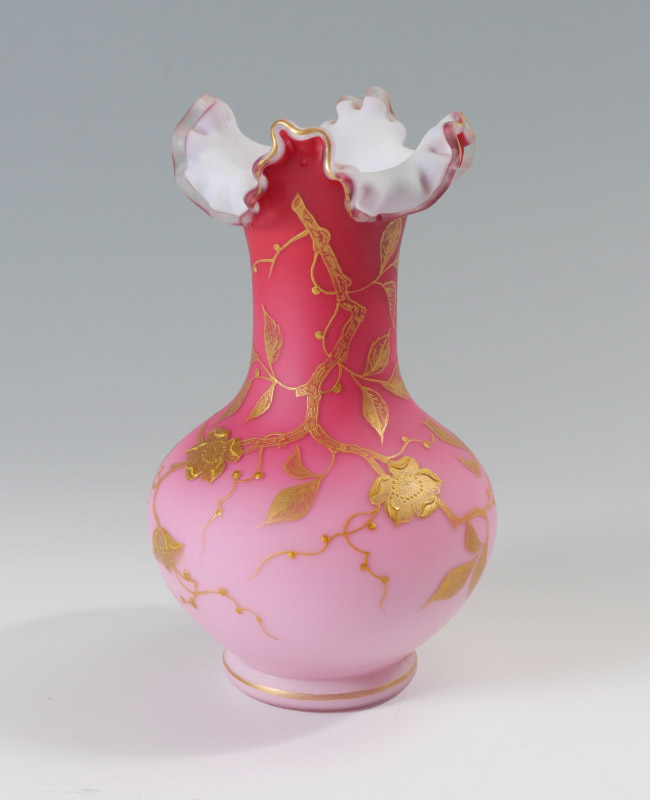 MT. WASHINGTON PEACH BLOW ART GLASS VASE: Ruffled rim, gilt floral decoration, marked on base ''662/2, R 500, I''. 9'' x 5 1/4''.