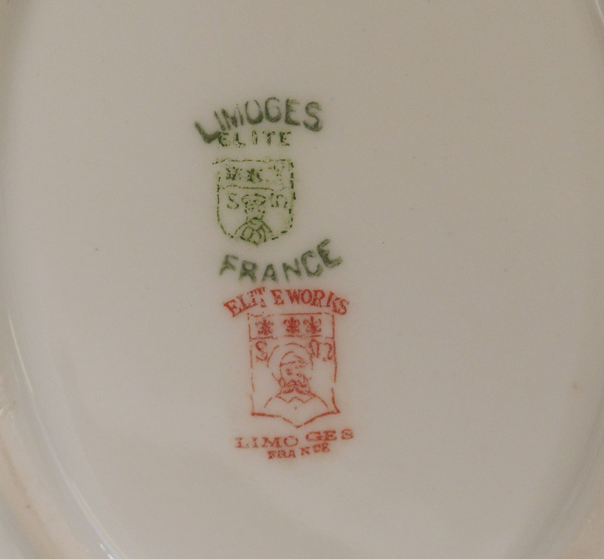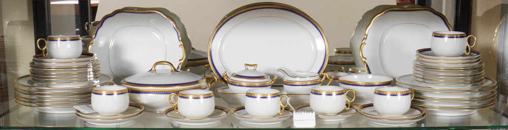 FRENCH LIMOGES FINE CHINA: Early 1900's Bawo & Dotter Elite Works. Approx. 56 piece gold and cobalt rim china to include 12 plates (8 3/4''), 12 plates (6 1/4''), 12 cups, 12 saucers, 2 serving plates, covered vegetable, relish dish, cream and sugar.
