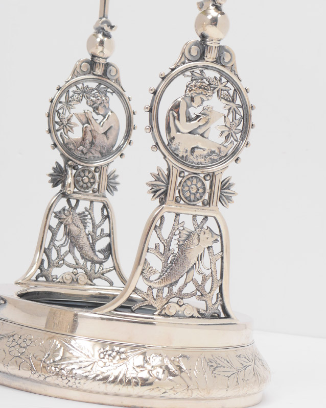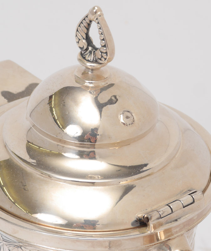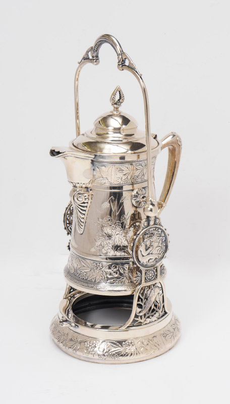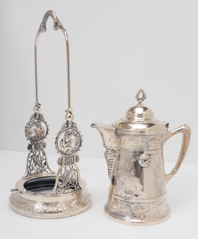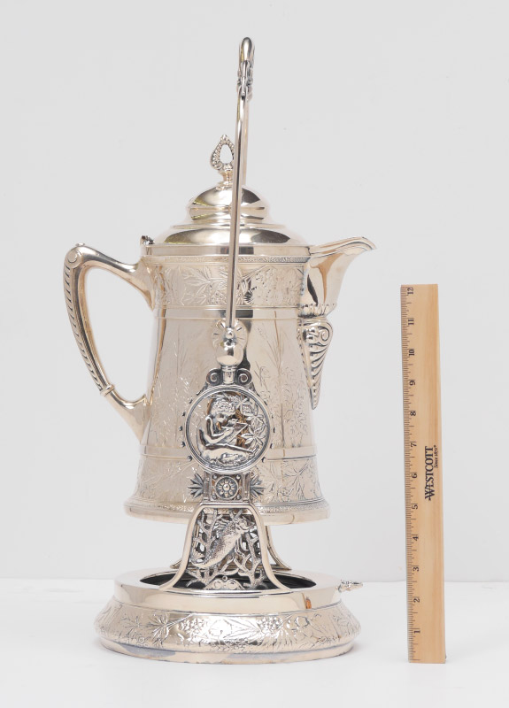 VICTORIAN SILVER PLATED ICE WATER TIPPLER: Engraved and embossed floral decoration, articulated on stand or removable to stand alone. Meriden marked on base, overall 21'' h. x 8 1/2'' x 10''.
