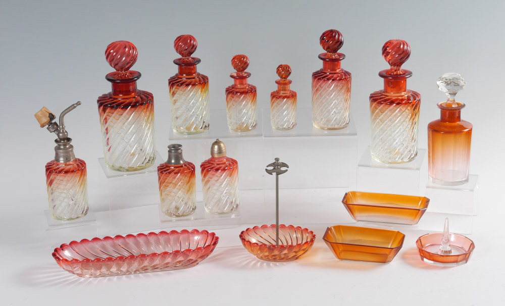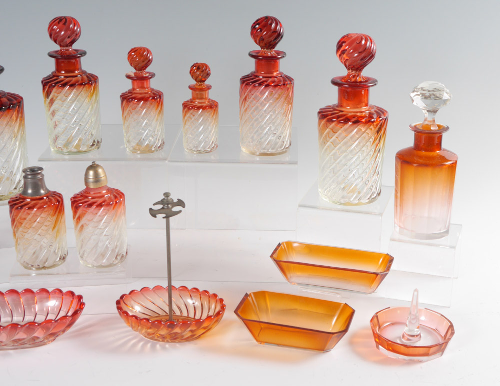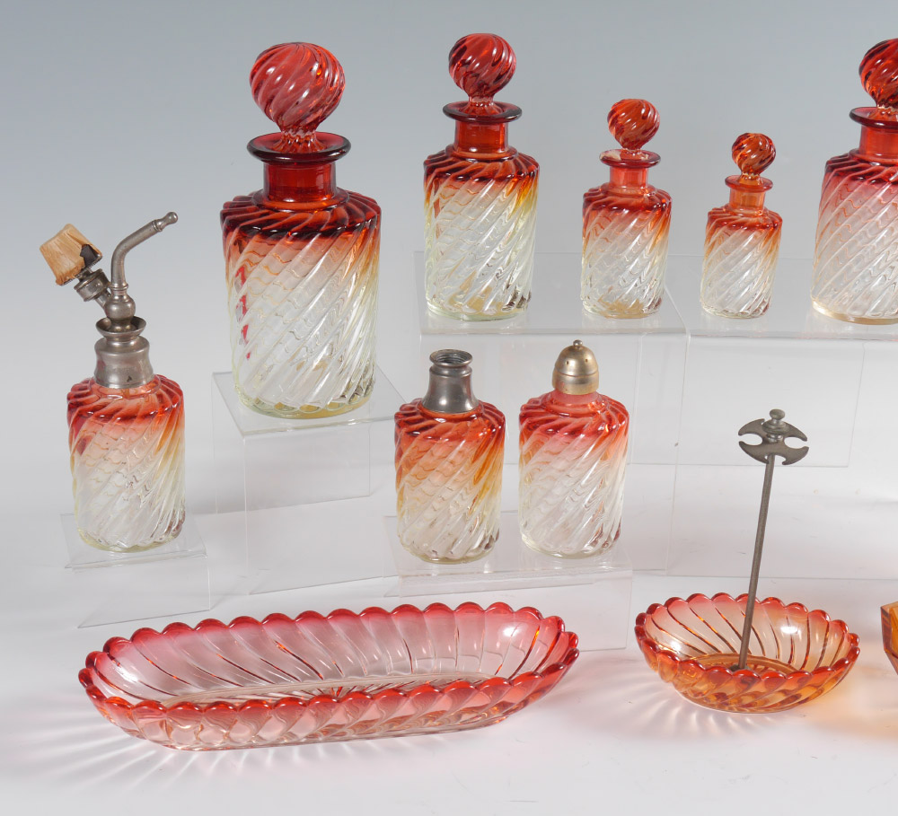 BACCARAT SWIRL ROSE TIENTE DRESSER TOP GLASSWARE: Approx. 15 pieces to include 6 perfume bottles (4''-8 1/2'') a 10' tray, tooth brush holder, 3 atomizer bottles, a ring holder, 2 pin trays and one more bottle, 7''.