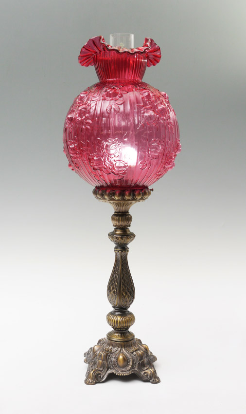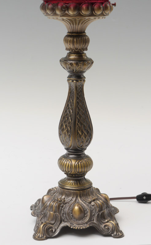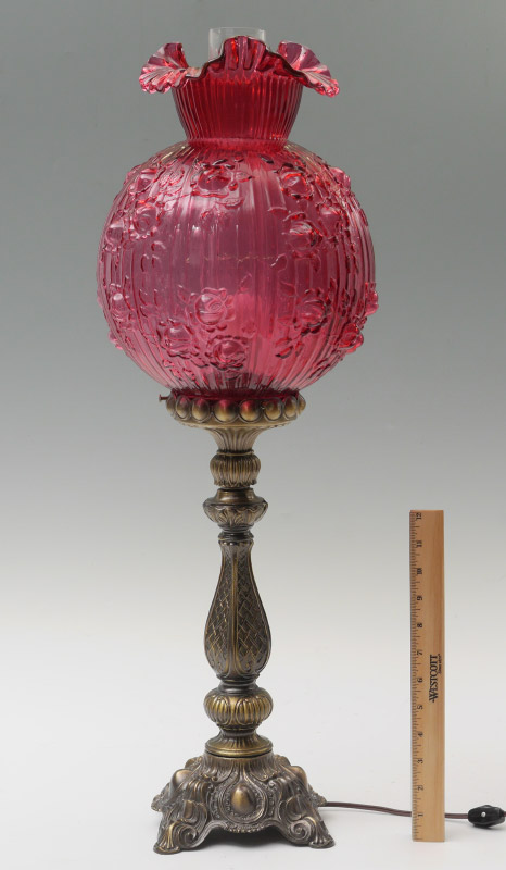 CRANBERRY GLASS SHADE TABLE LAMP: Patinated cast metal base, embossed and ribbed floral motif cranberry glass shade with ruffled rim, clear glass chimney. Base measures 16 3/4'' h. x 6 1/4'' x 6 1/4'', shade 13'' h. x 10'' with a 4 1/4'' fitter rim, chimney 14''.