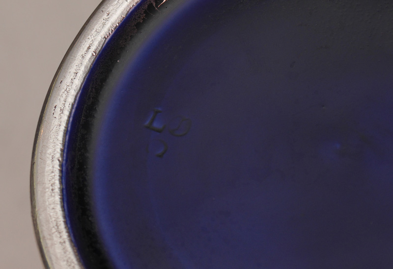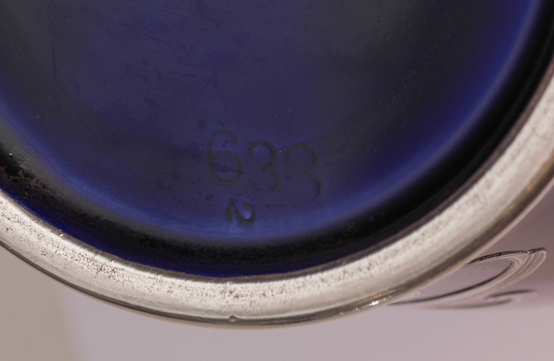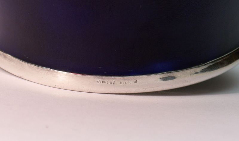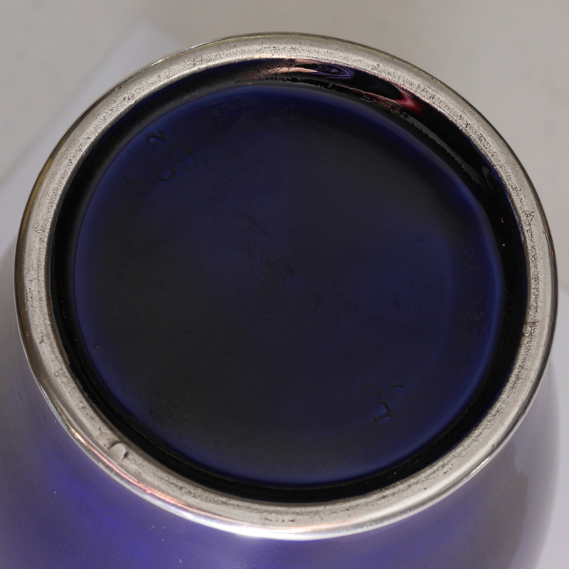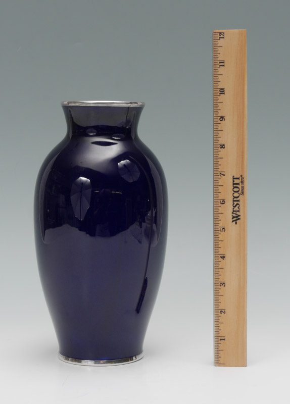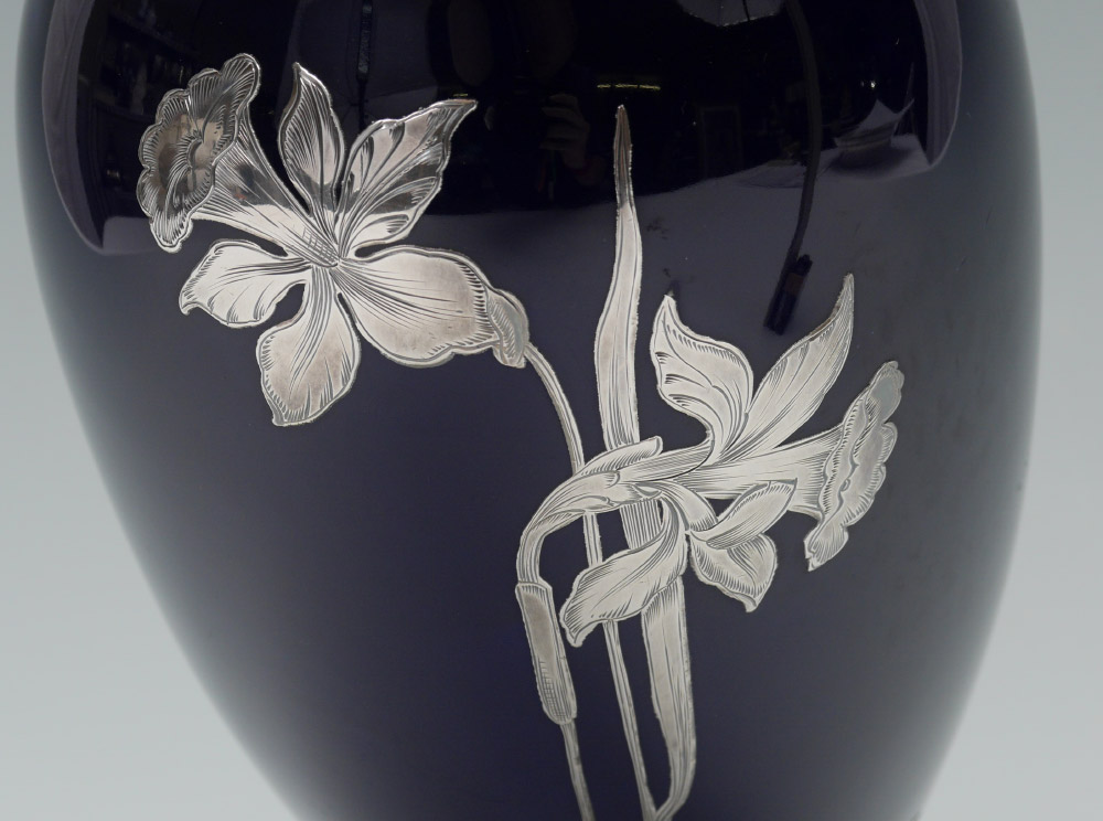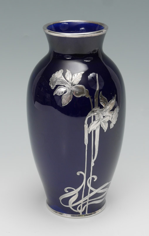 ART NOUVEAU STERLING SILVER OVERLAY VASE: Daffodil design over cobalt glaze pottery. Silver is stamped ''Sterling'', pottery has illegible impressed letters. Approx. 9 1/2'' tall, 5 1/2'' wide overall.