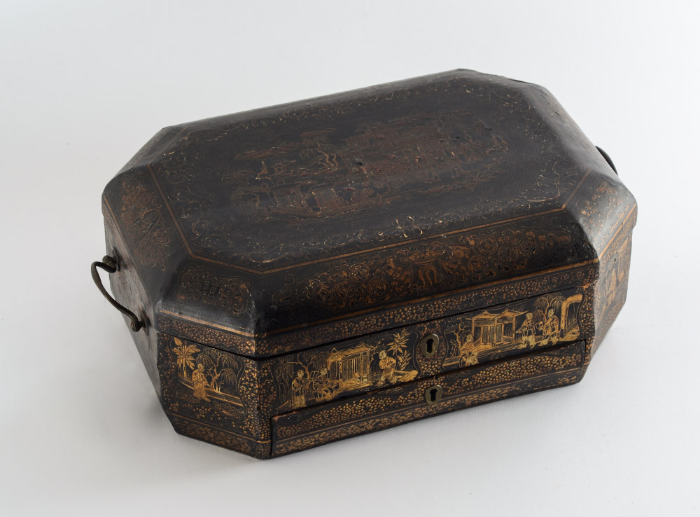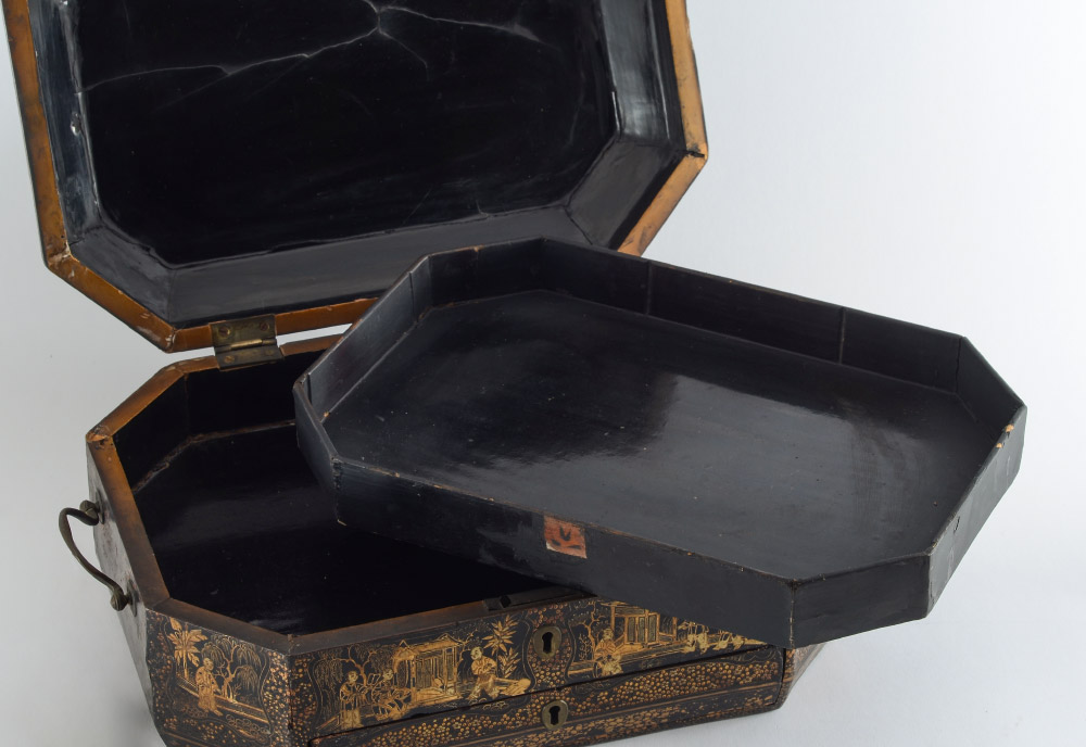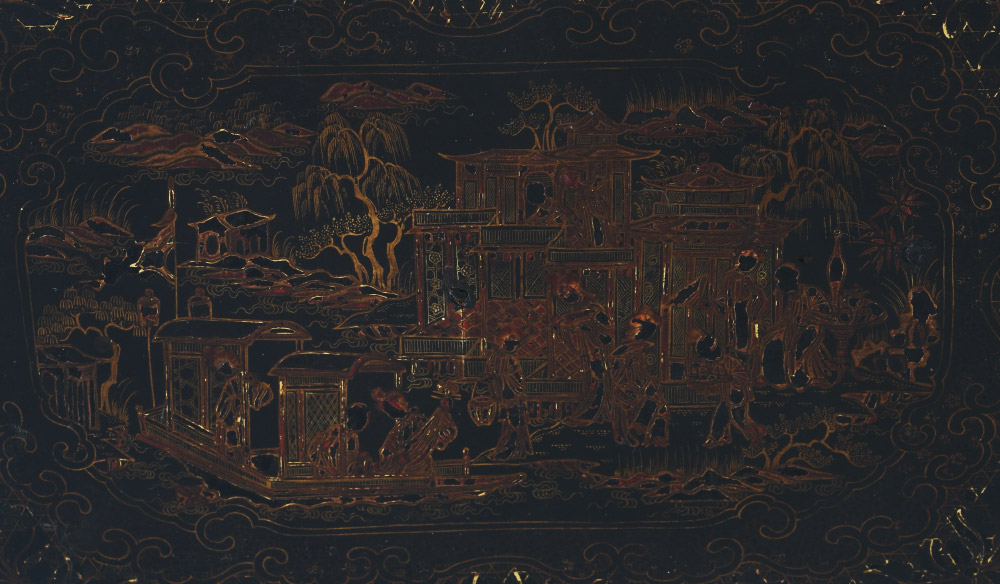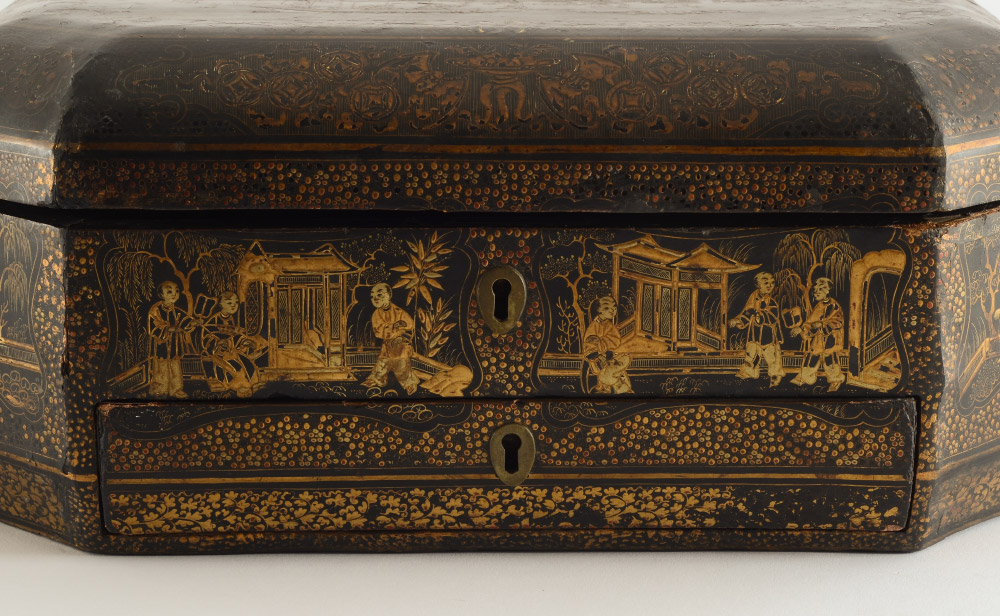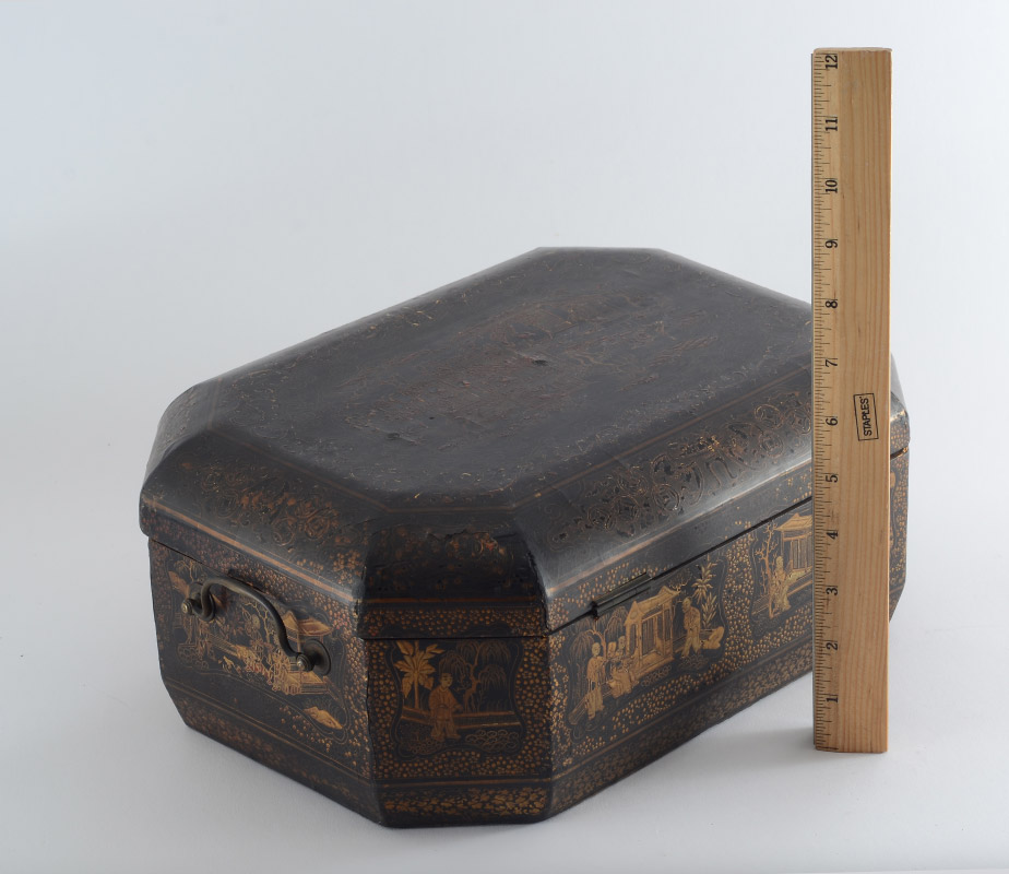 CONDITION: Dark patina, cracking to lacquer, chips to case, lower drawer compartment lid missing a hinge. Sold as-is.