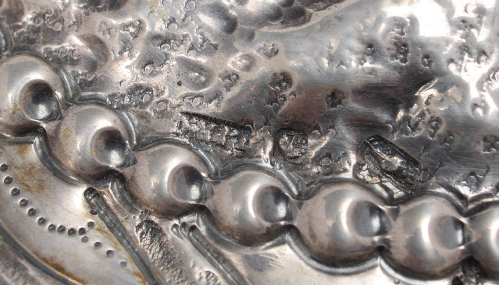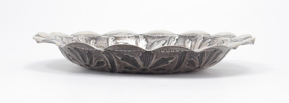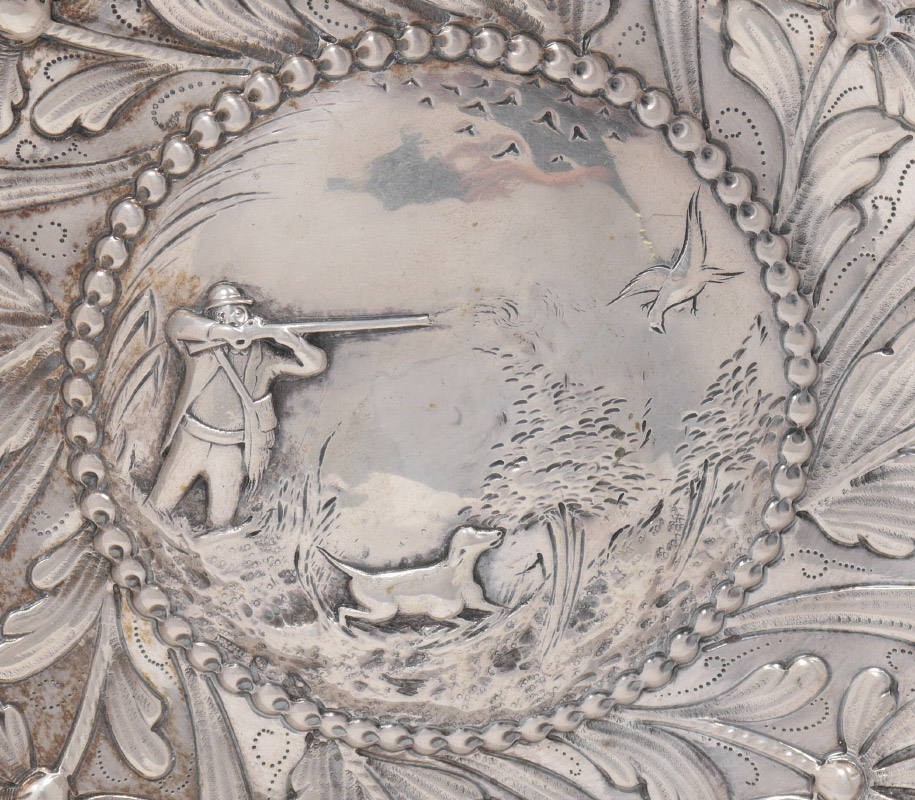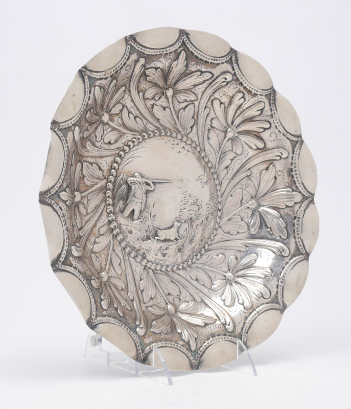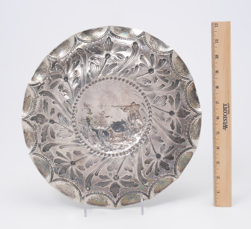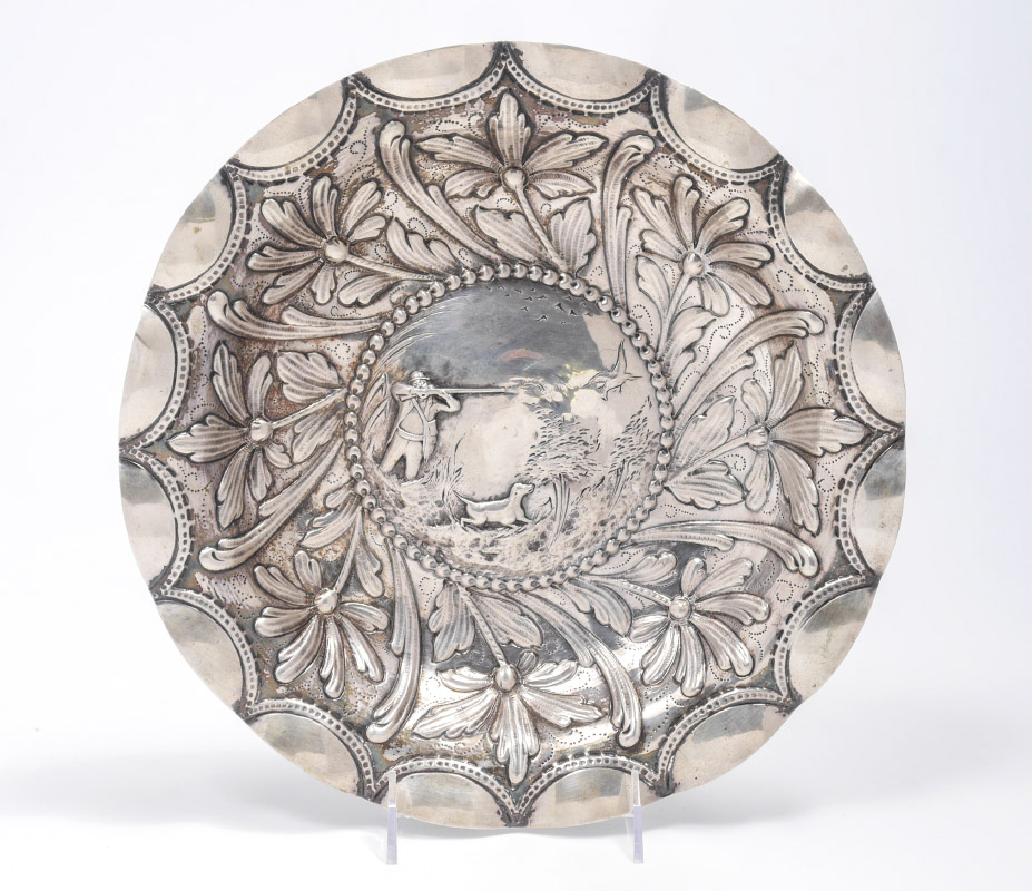 PORTUGESE STERLING EMBOSSED HUNTING SCENE BOWL: Scalloped rim over embossed floral motif, raised center medallion with scene of hunter and retriever. Overall measures 1 3/4'' h. x 12'' dia., approx. 16.3 troy oz.