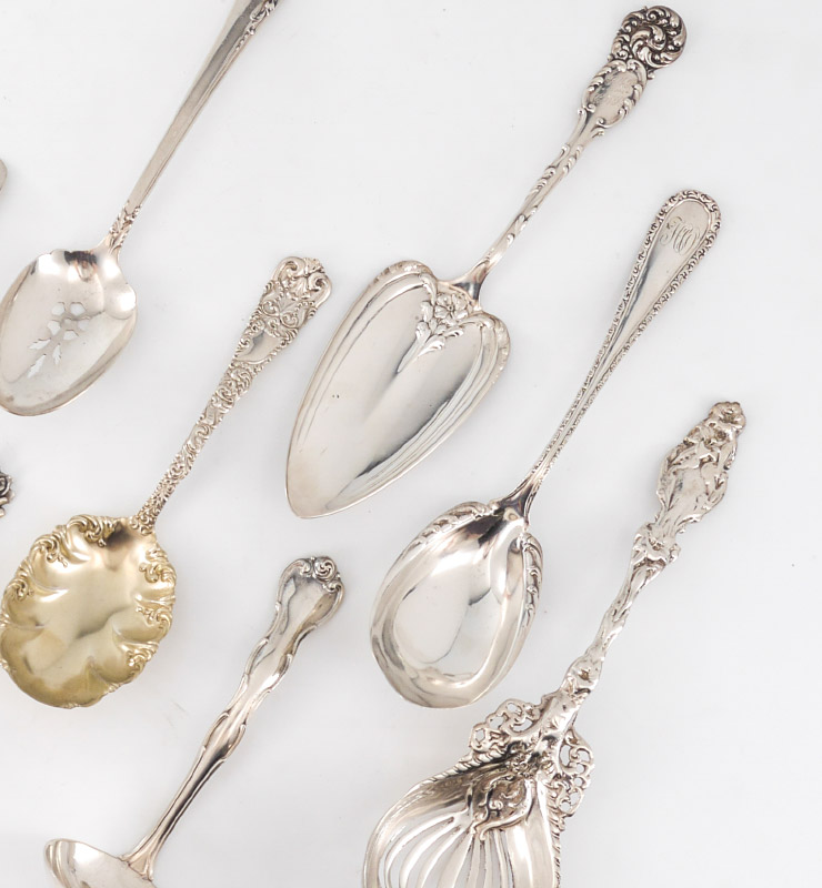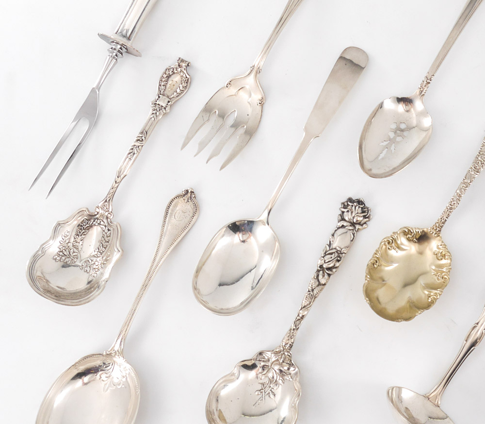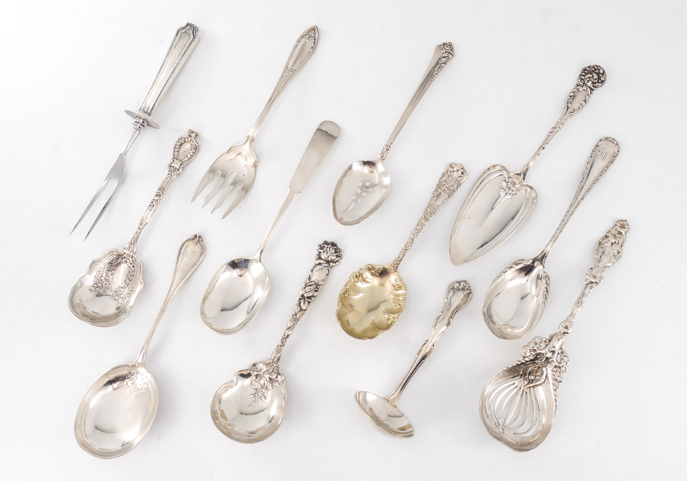 12 PIECE ESTATE COLLECTION STERLING FLATWARE: 12 pieces total, assorted patterns by assorted makers to include Alvin, Heirloom, Durgin, Reed & Barton, Towle, Gorham and more. Several pieces monogrammed, longest pieces measures 9 1/2''. Approx. 26.3 troy oz.