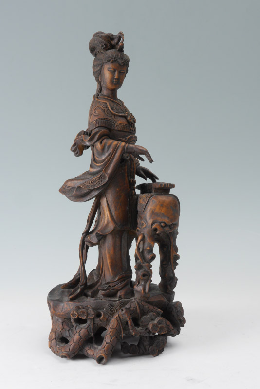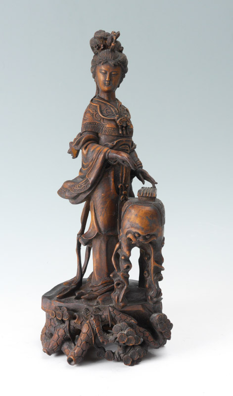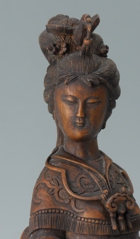 CHINESE CARVED WOOD FIGURE OF A WOMAN: Nicely detailed figure of a woman standing behind a musical instrument on stand with rug. Carved wood base, no visible signature 16'' x 6 1/4'' x 7''.