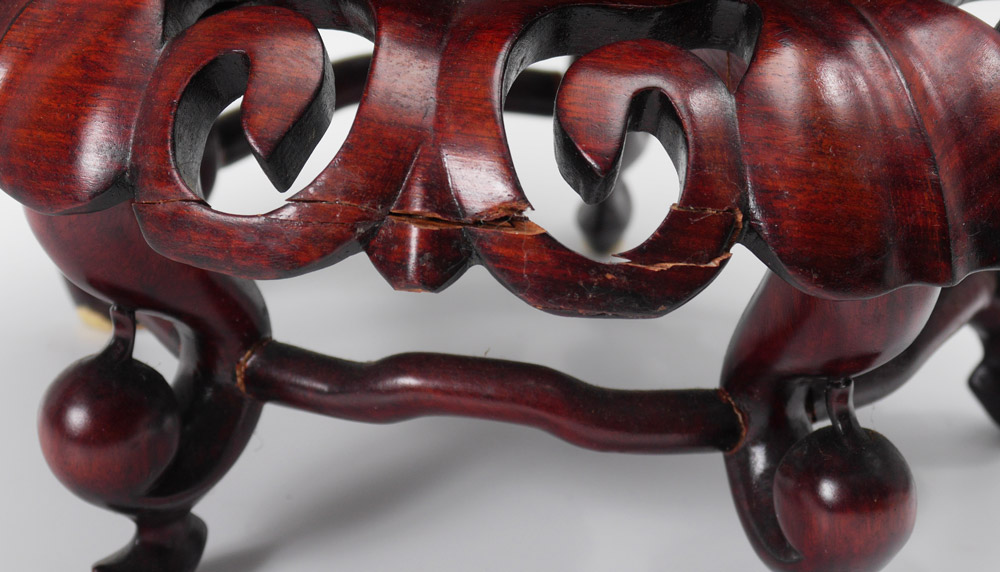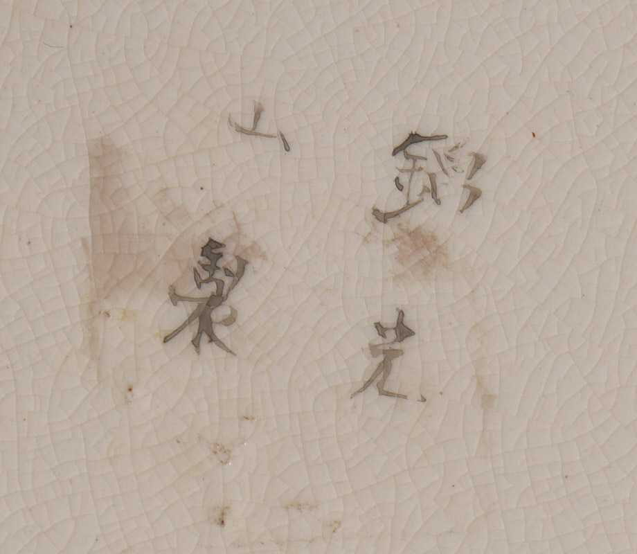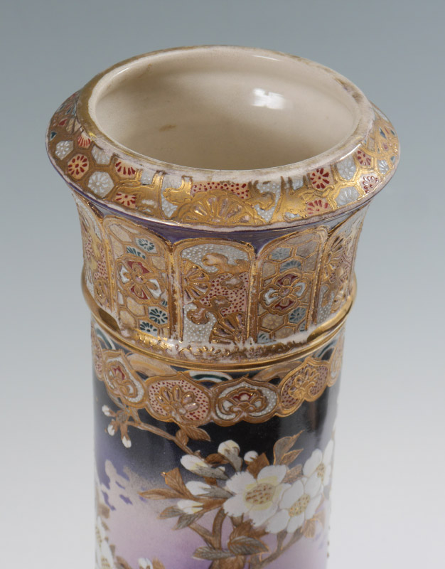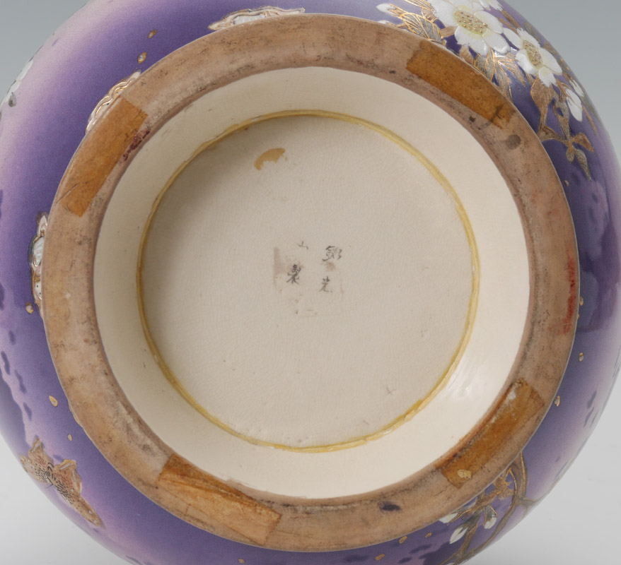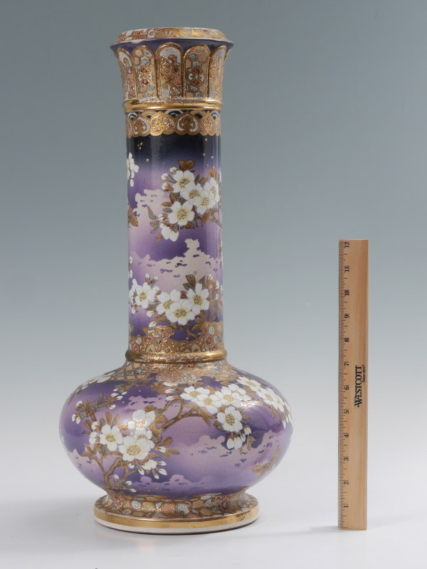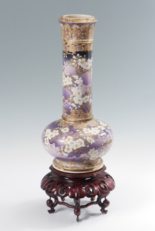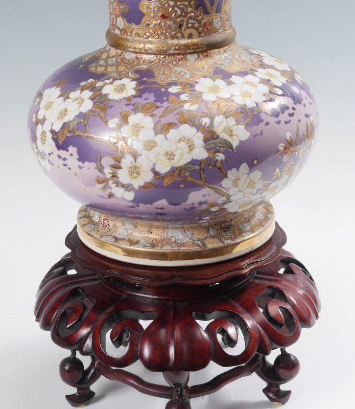 LARGE SIGNED JAPANESE EARTHENWARE SATSUMA VASE: Bottleneck form richly decorated on unusual lavender ground. Signed in characters. Measures approx. 21 1/2'' tall. The wood stand adds another 7'' to the height.